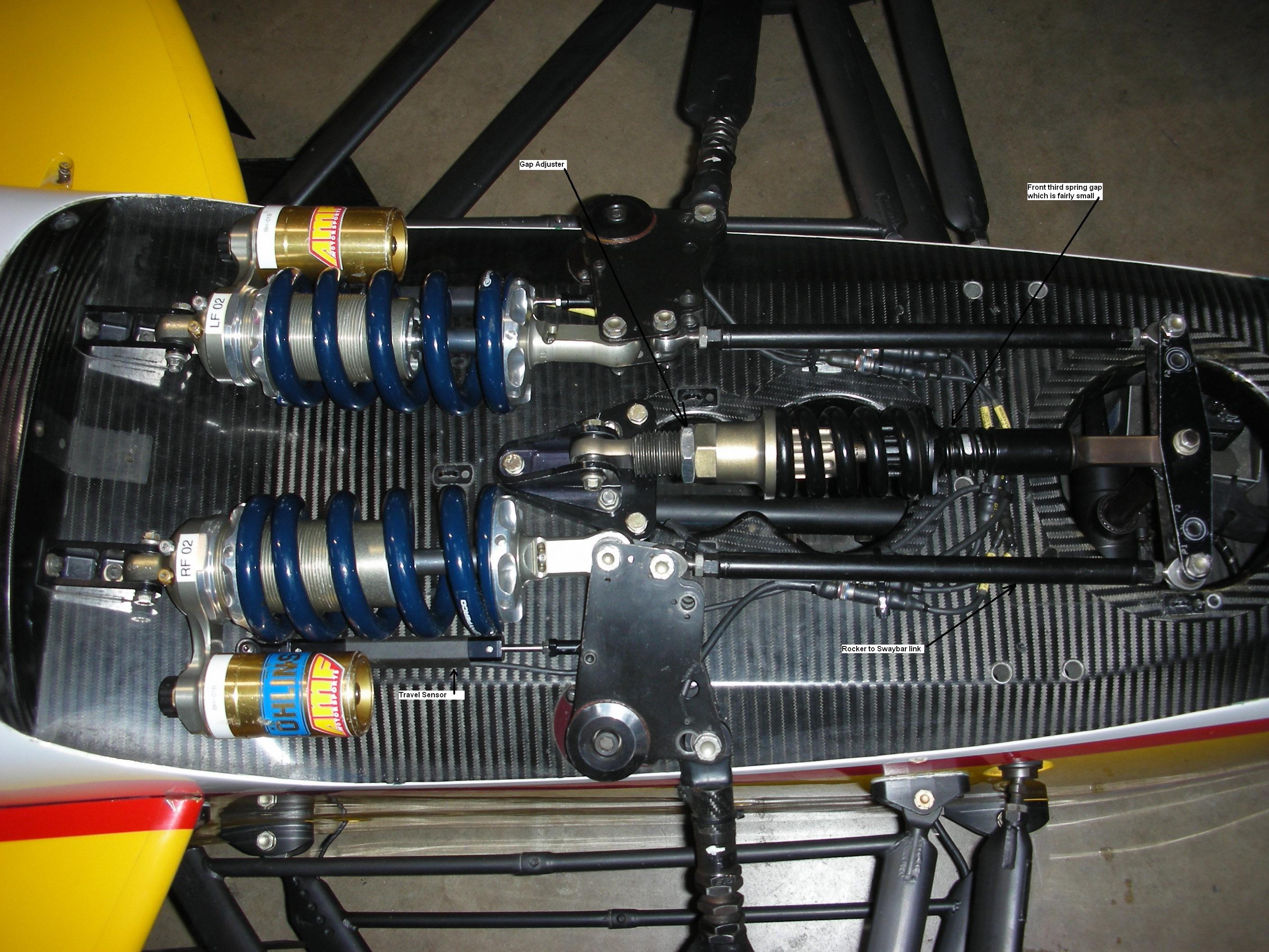 The designers at Lola have implemented a “third spring” in addition to the two primary springs on the front and rear of the car to address this problem.  This third spring allows the use of softer primary springs which function at lower speeds with the third spring coming into play when speeds increase and the chassis is blown down towards the track.  I run third springs in the 3500 lb/in range while primaries are more like 1800 front and 1200 rear.