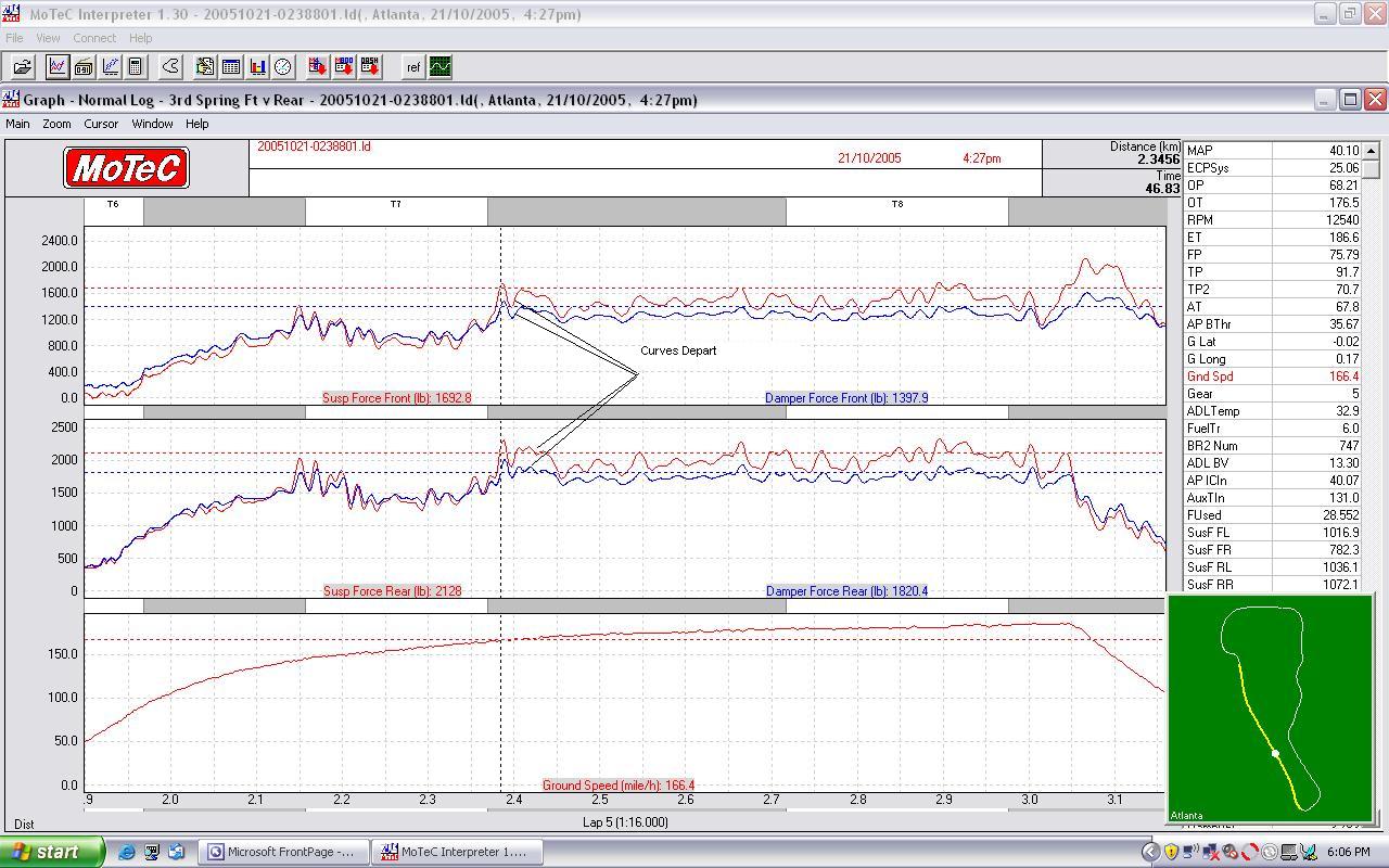 I set my data acquisition up to calculate and display wheel force for each corner based on both the primary damper spring compression and the direct display of pushrod loads.  I check the third spring settings for both the front and rear during the first track session (before I even get up to speed on the corners) by doing a full speed run down one of the straights.  It is very easy to see how the primary spring generated wheel load and the pushrod wheel load follow each other right up until the suspension lands on the third spring.  Once the third spring is touched, the pushrod loads continue to rise much more aggressively than the primary damper spring generated loads so the curves depart.  I’ve got an example below.   You simply increase or decrease the gap before the suspension compression starts to compress the third spring thus adjusting when you land on the third spring as you gain speed.  Once set up, my third spring configuration has stayed pretty much the same.  I check it at every track but seldom adjust the gaps.