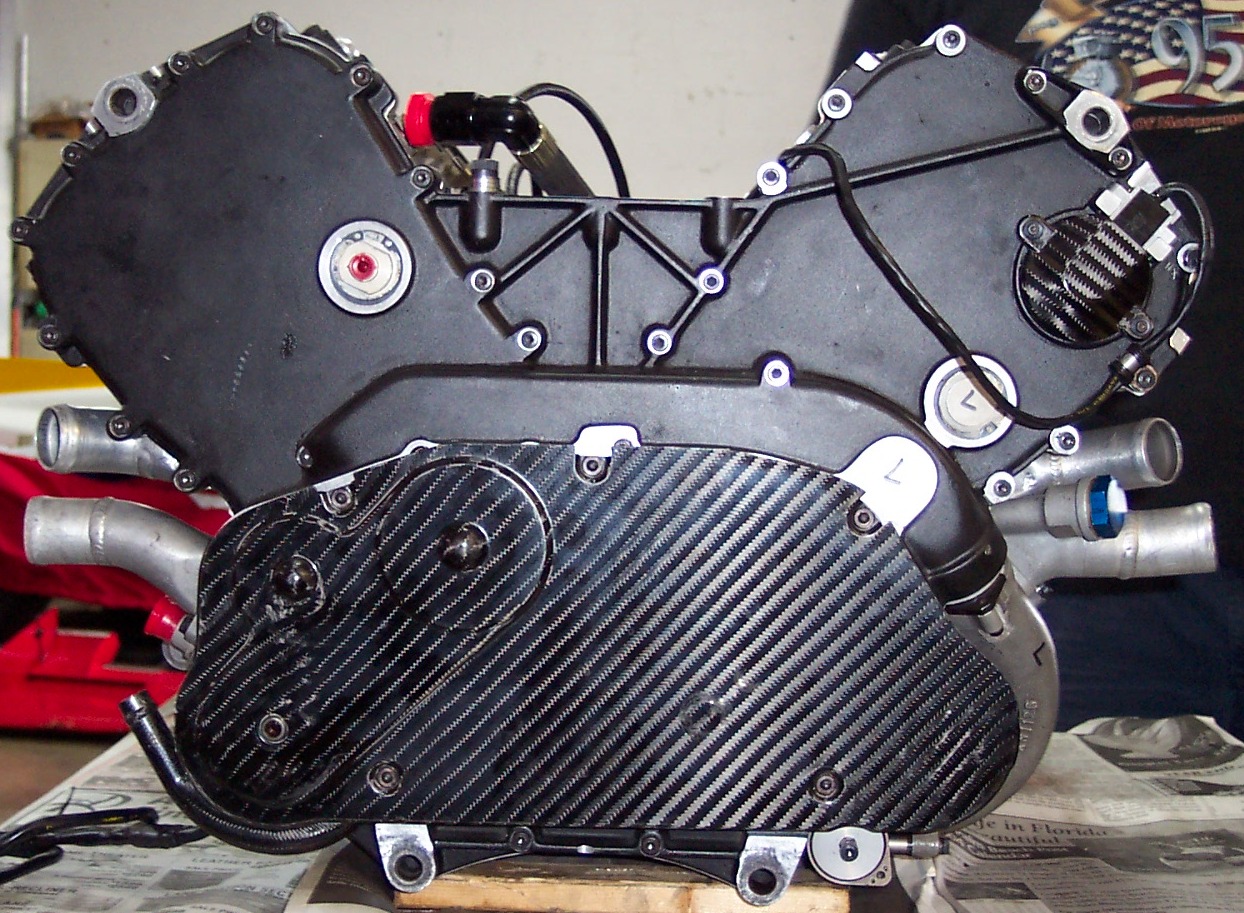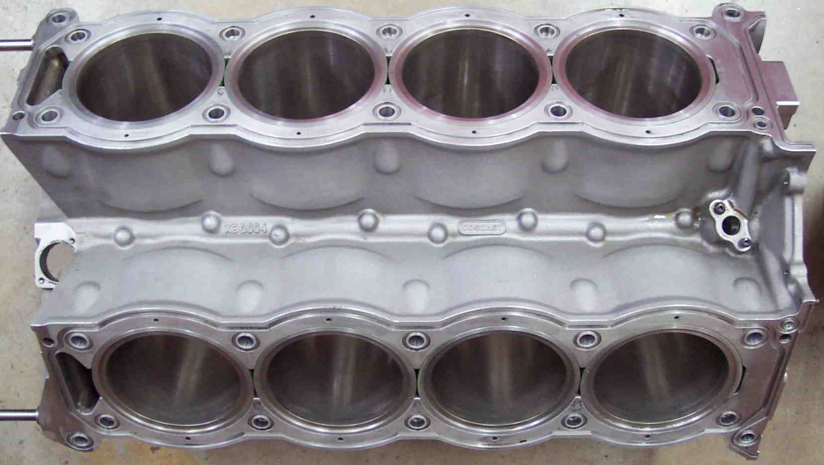 Construction: The XB, like the DF before and the XD after, is based on a wet lined alloy block with nicasil aluminum liners. The pictures below show the intricate nature of the casting and the quality generated by Coscast. The four overhead cams are driven from the front of the engine by a spur gear set which drives two chains, one to each head. Chains are replaced at ten hour intervals when using a 12,000 RPM limit.