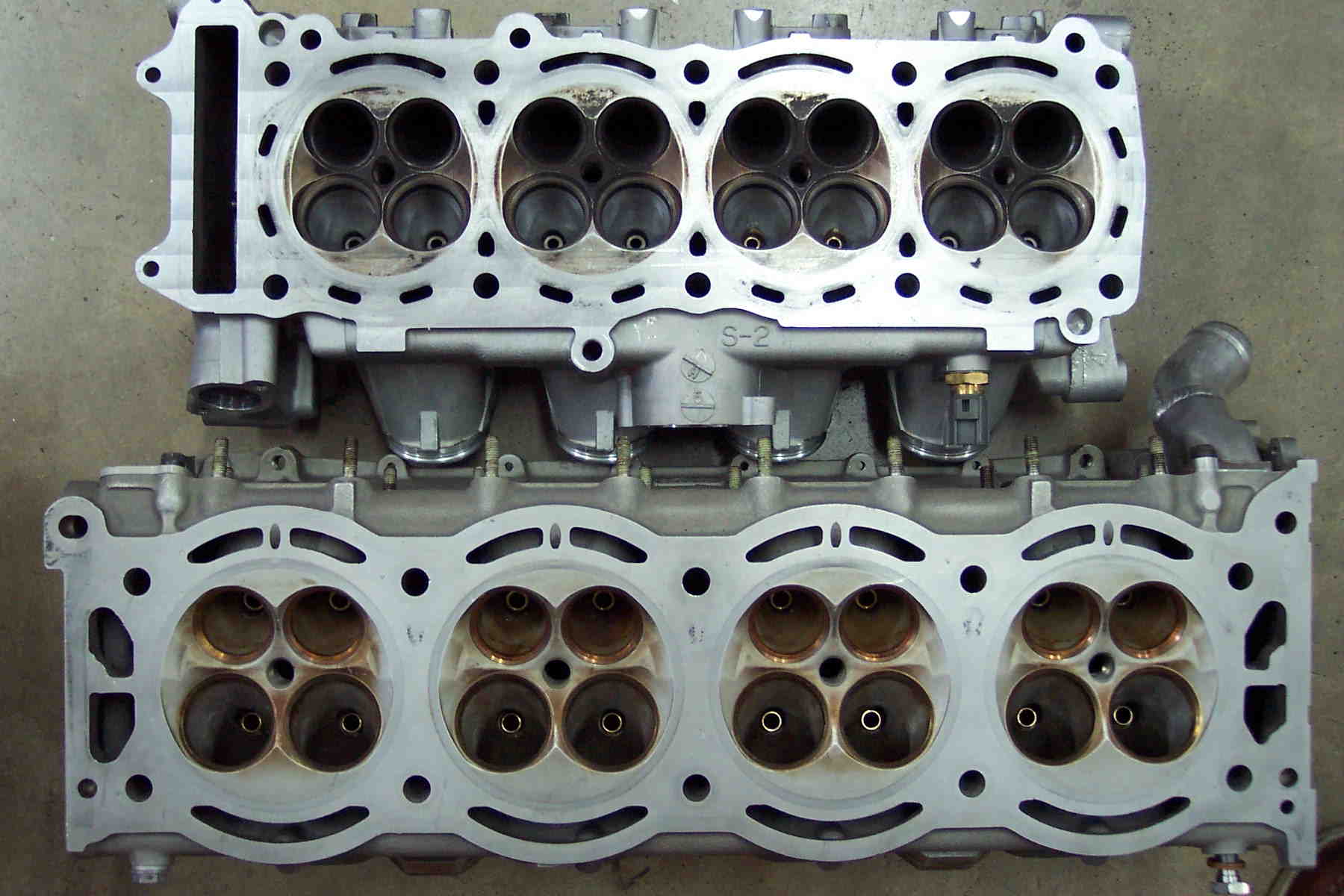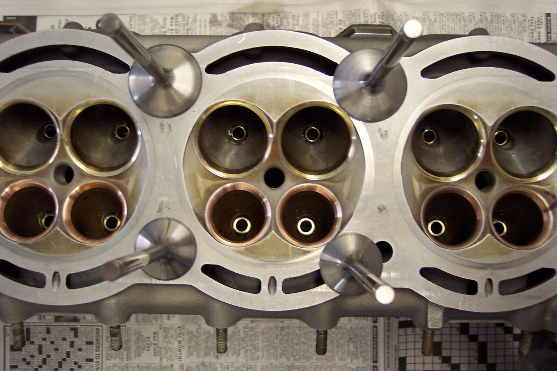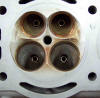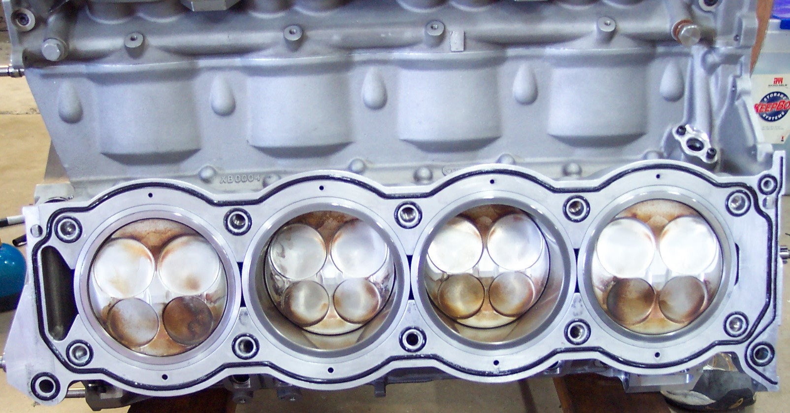 Performance: The Series Two engine produced in excess of 283 horsepower per liter of displacement. For comparison, a very well built normally aspirated Hayabusa engine with nearly the same displacement per cylinder produces 188 horsepower per liter on gasoline. I have included a picture of a "Busa" piston placed on an XB head as a comparison of the difference in bore (with a corresponding difference in stroke). There is also a picture of their respective intake and exhaust valves in addition to a picture of their respective heads. In the end and side views of the valves, the left side is XB while the right is Busa; the top being exhaust.
