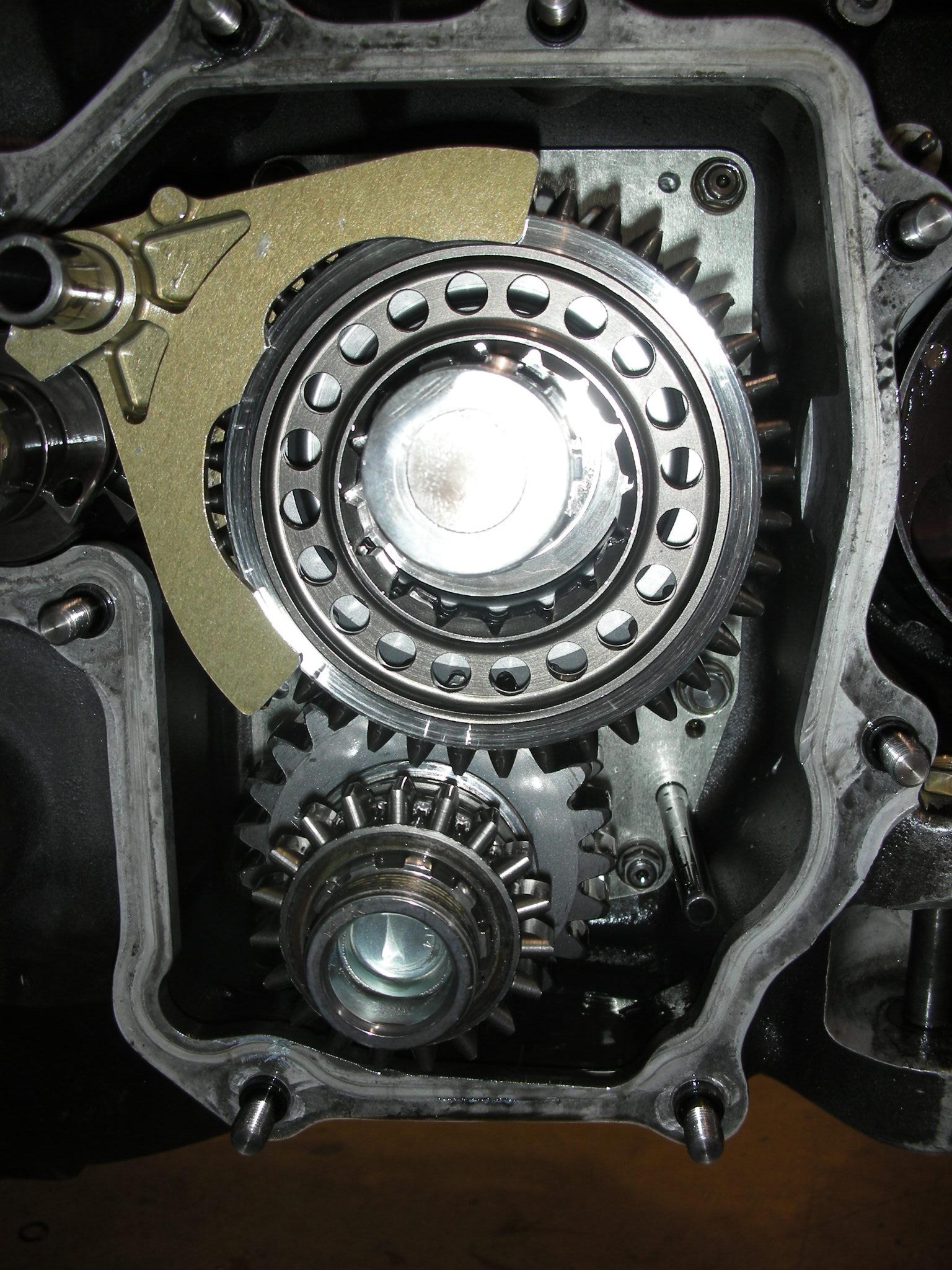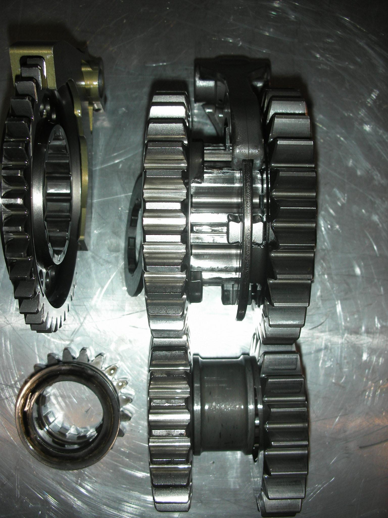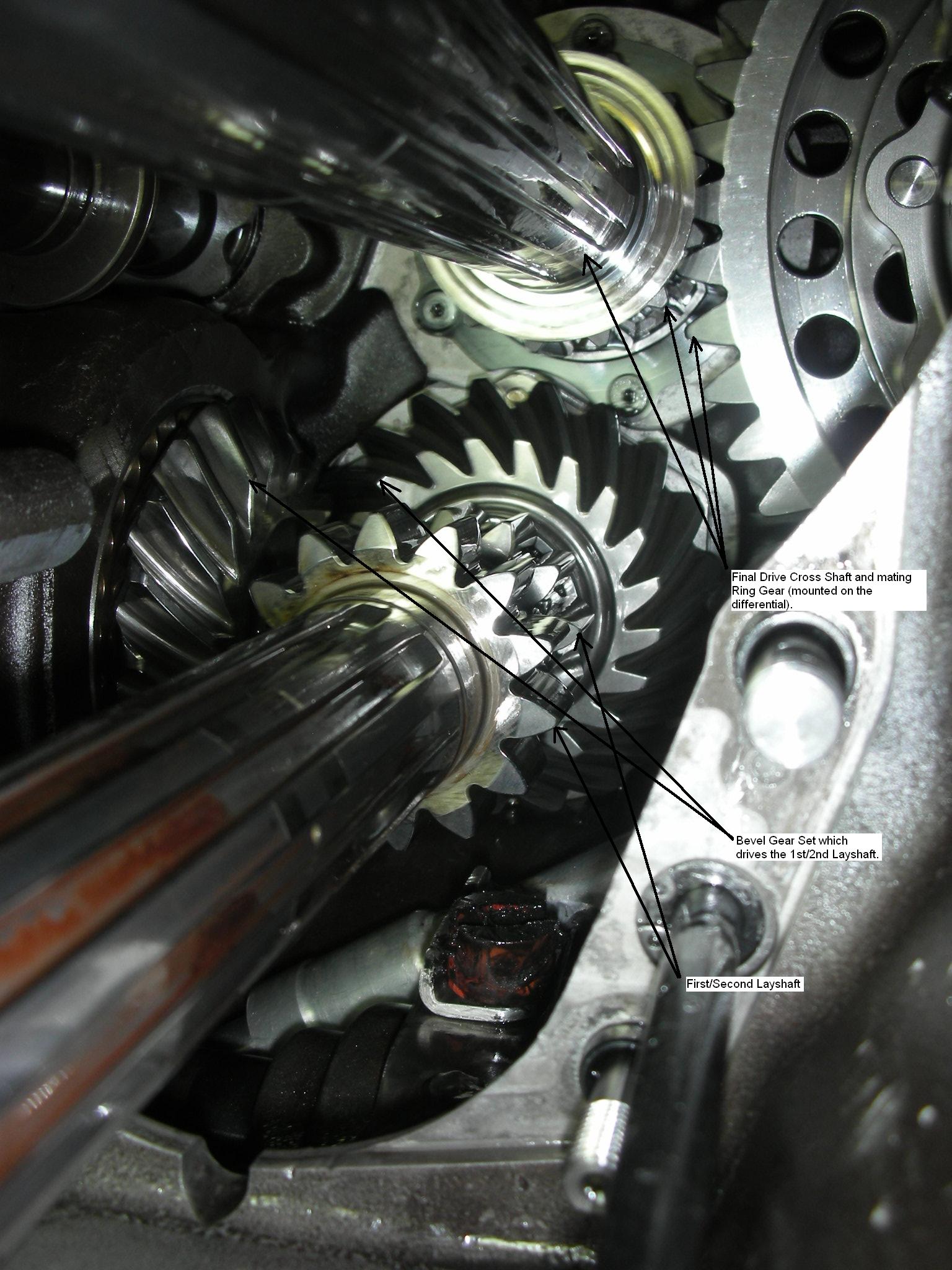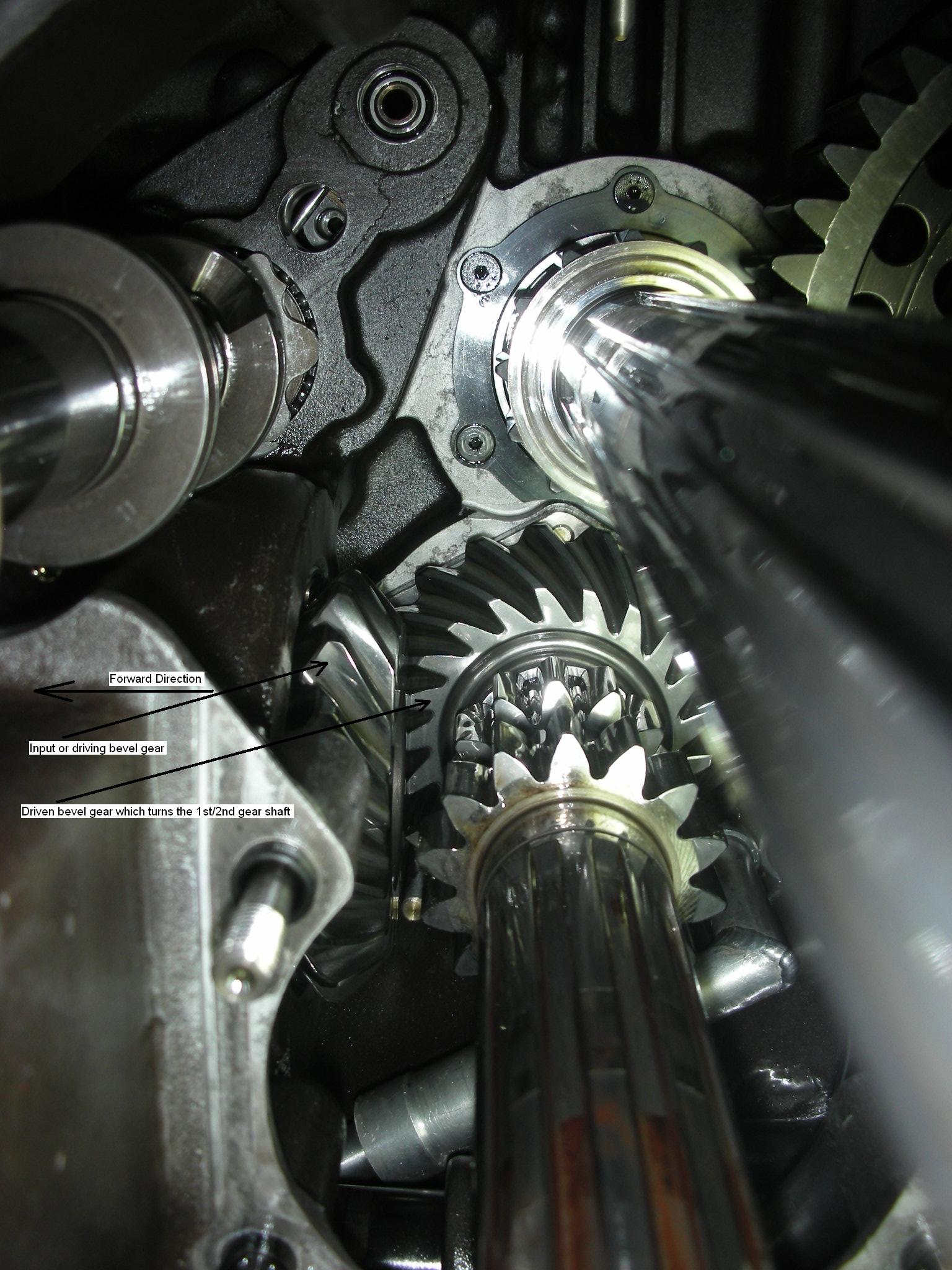 below. The "driven" bevel gear then turns the 1st/2nd layshaft which turns