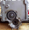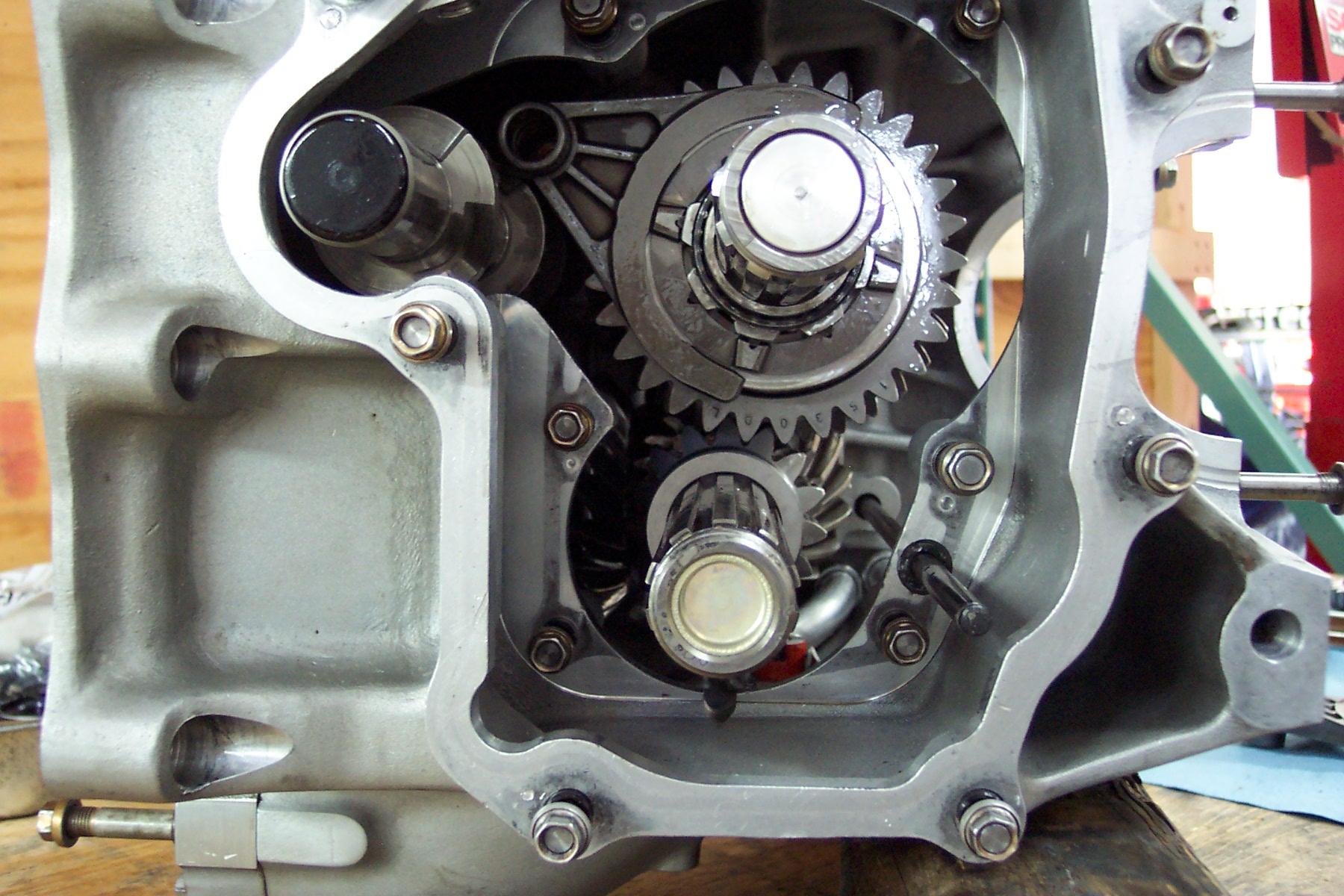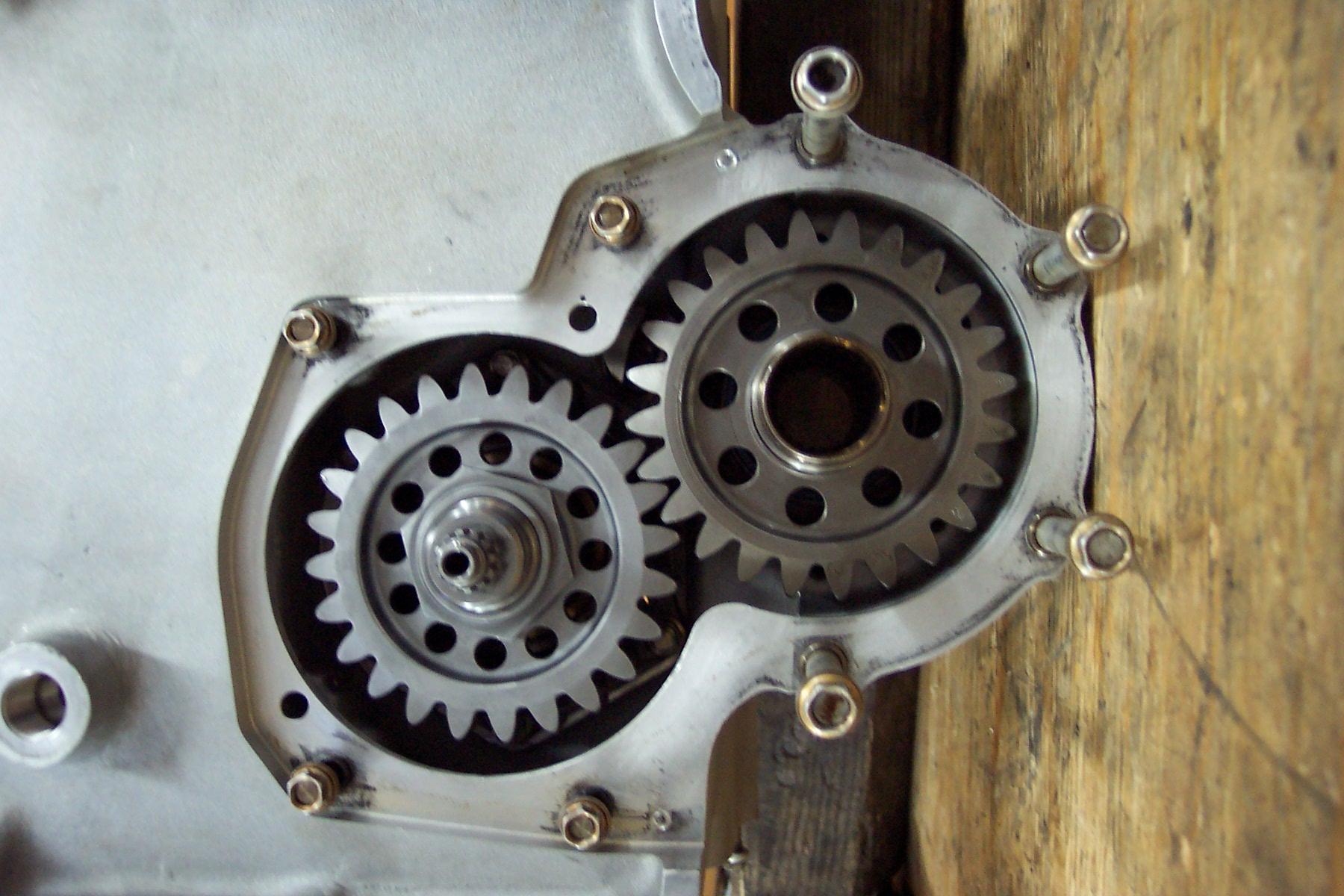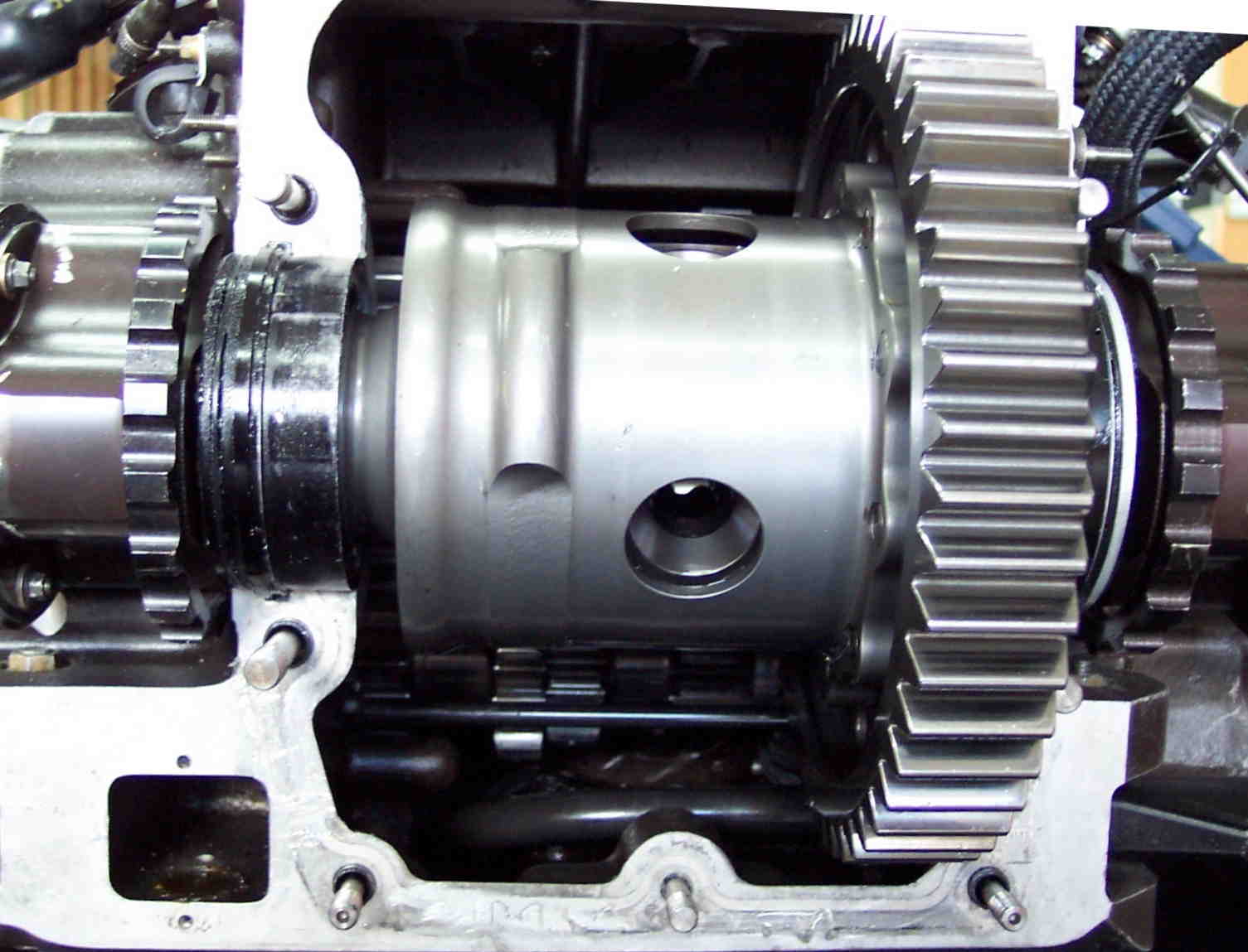 The 1994 and newer Lola Indy/ChampCars have transverse sequential gearboxes very similar to a motorcycle's gearbox. There is a shift drum that is driven by a ratcheting shift arm which moves dog rings into and out of contact with gear dogs via shift forks. Final drive consists of a spur gear set driven directly from the output shaft. Power is supplied via an input shaft, through a set of drop gears at the front of the gearbox then through a bevel gear set which drives the transverse layshaft. The 95 and 96 cars have a dry sump oiling system with the rear cover housing the reservoir while the 99 has a wet sump. All of them use roots style scavenge and pressure pump sections. The Speedway and Road Course configurations use different drive gear sets to control oil pressure at the very different operating speeds.
