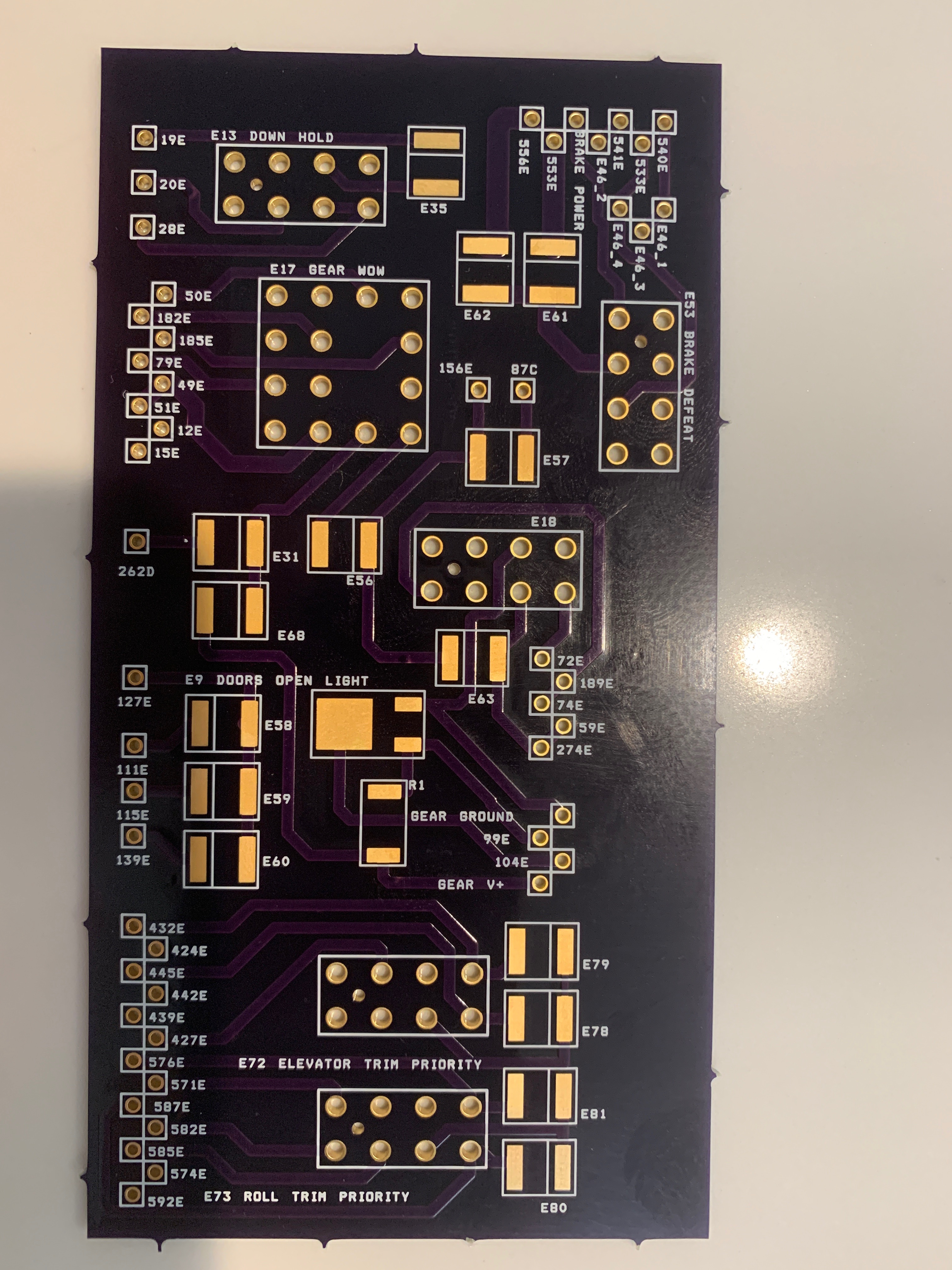 Version one used a lot of the original L39 cockpit wiring for gear, flaps, trim and ACM functionality. Version two will only retain the stock wiring in the wings that support gear, flaps and trim along with the stock wiring in the nose to support NLG. All other wiring will be light weight aircraft Tefzel wiring and the remaining L39 relay and diode boxes have been replaced by a single printed circuit board with modern aircraft relays and surface mount diodes. This one board contains the brake circuit, WoW gear related circuits and the trim priority elements. In addition, the stock latching flap button system has been replaced with a microcontroller controlled board to reduce weight, improve performance and allow for landing flap auto trim amount to be programmable (to stop full flap over pitch trim with a lighter UltimateL39 and a further aft CoG). The N1/N2 signal conditioning circuits have now both been done on the same board. See pictures below.