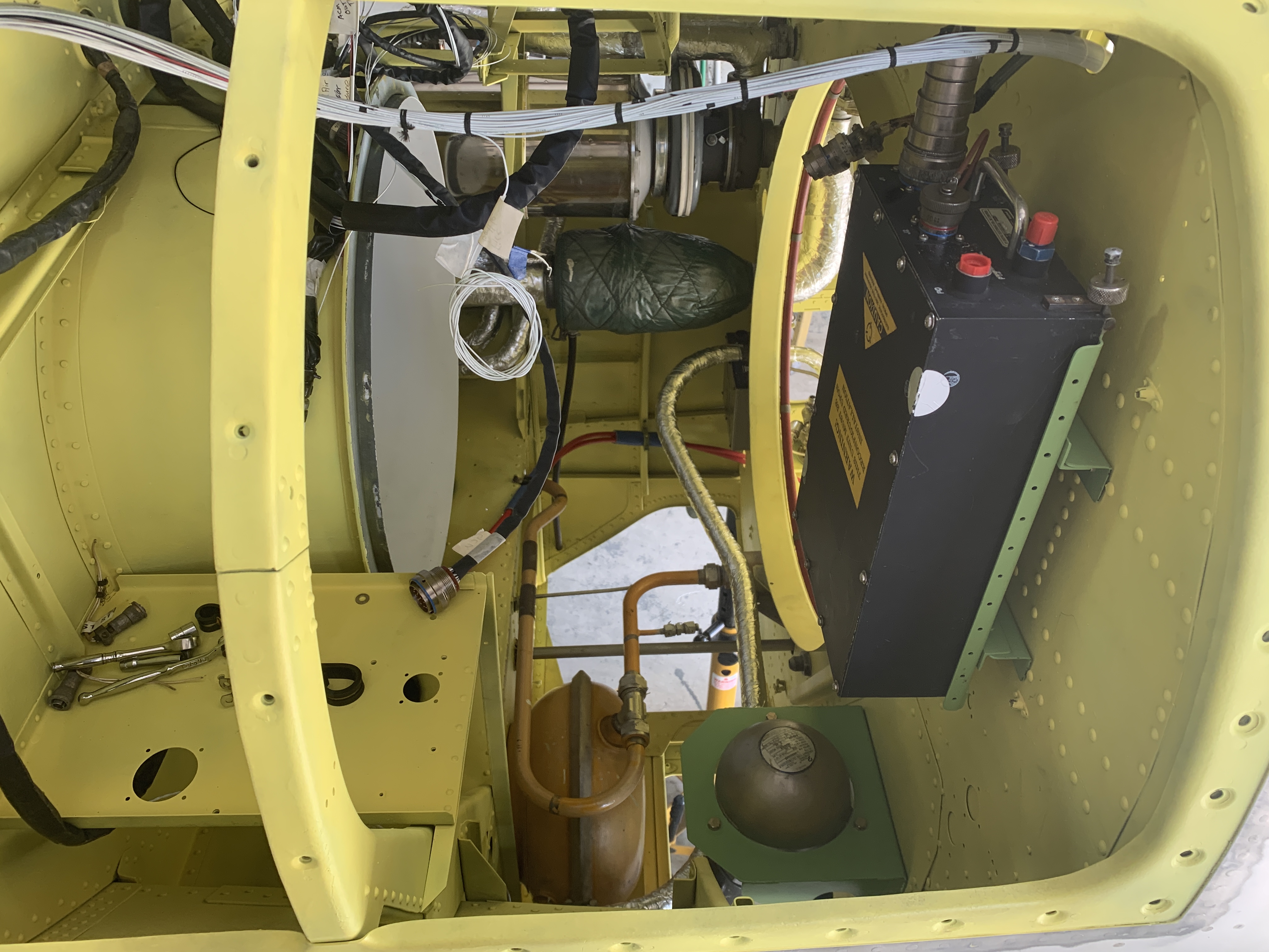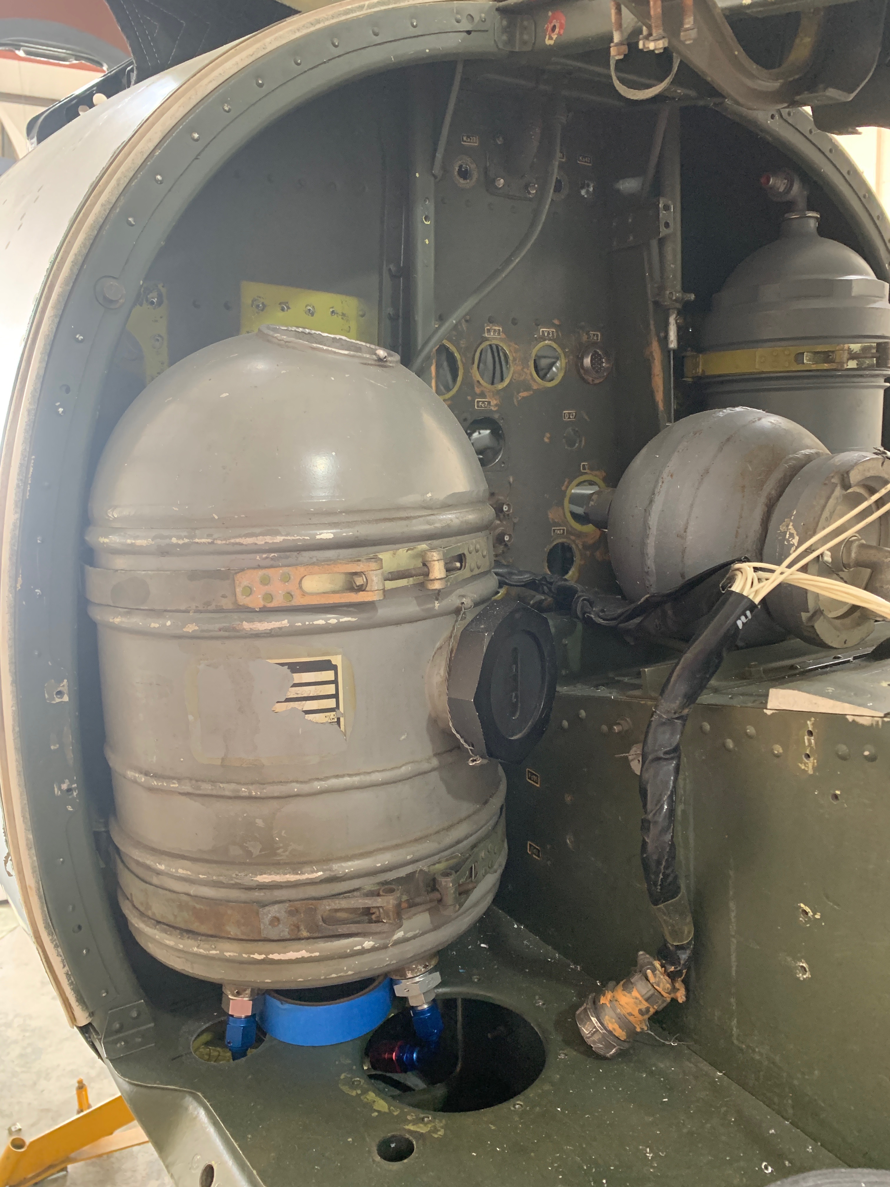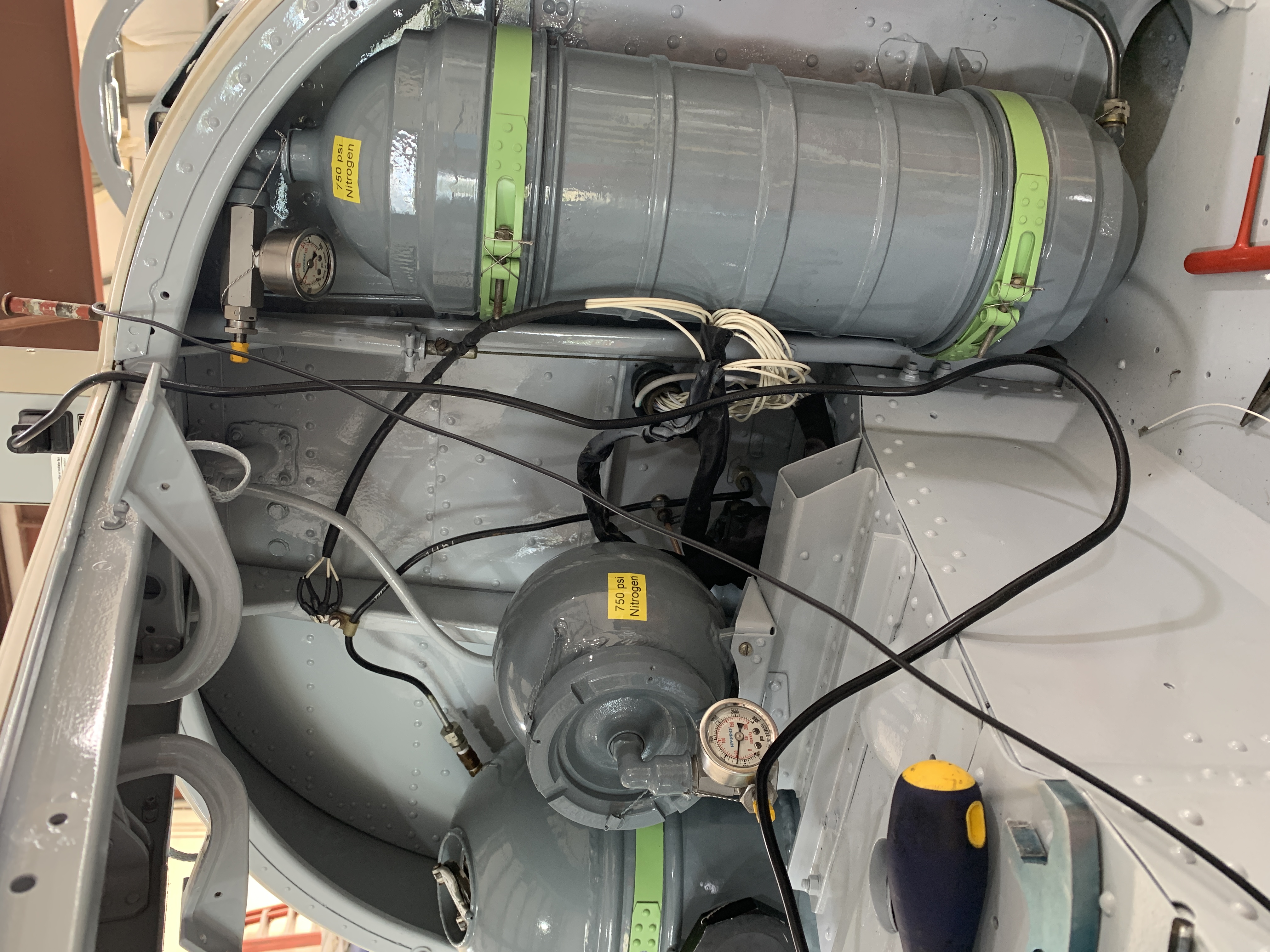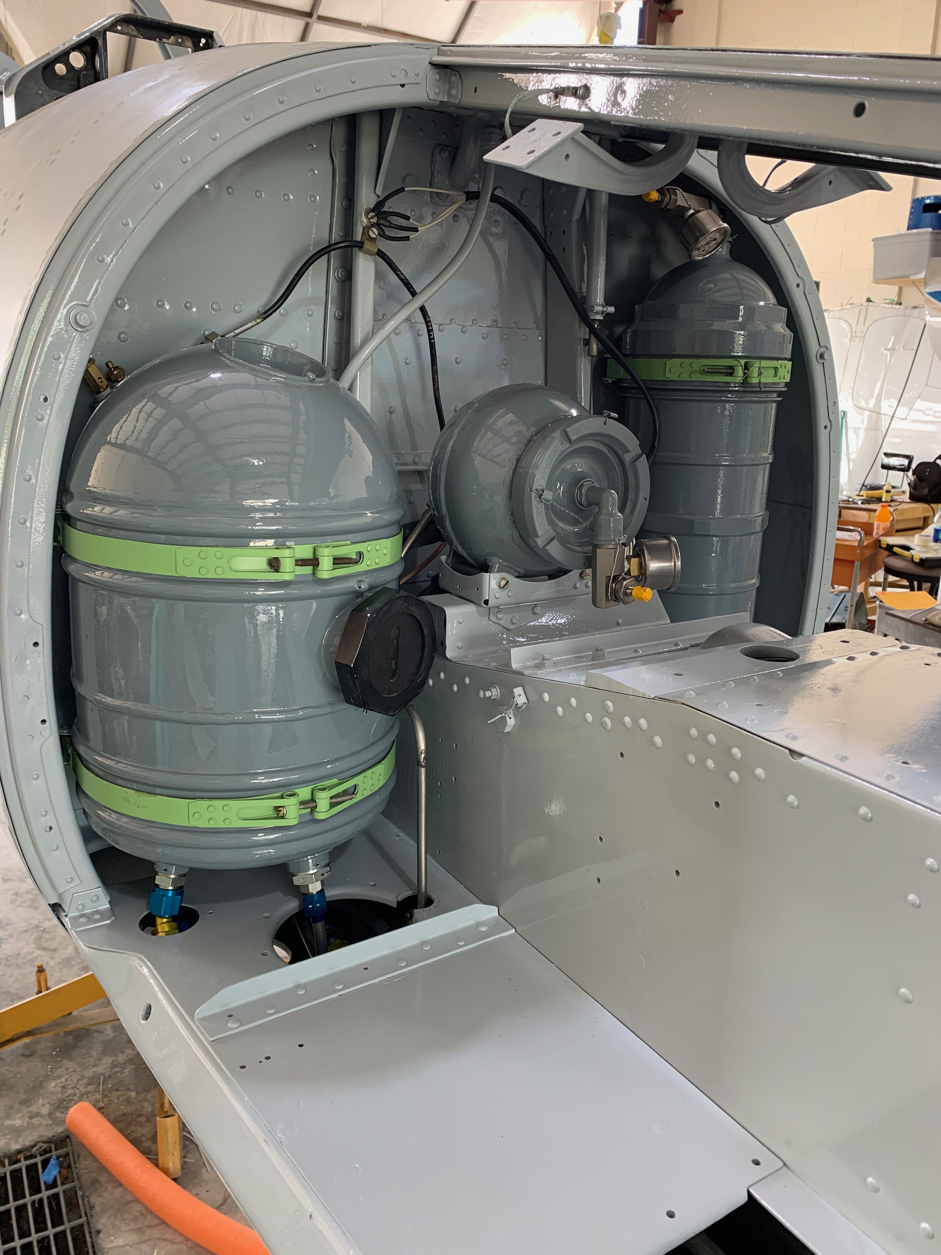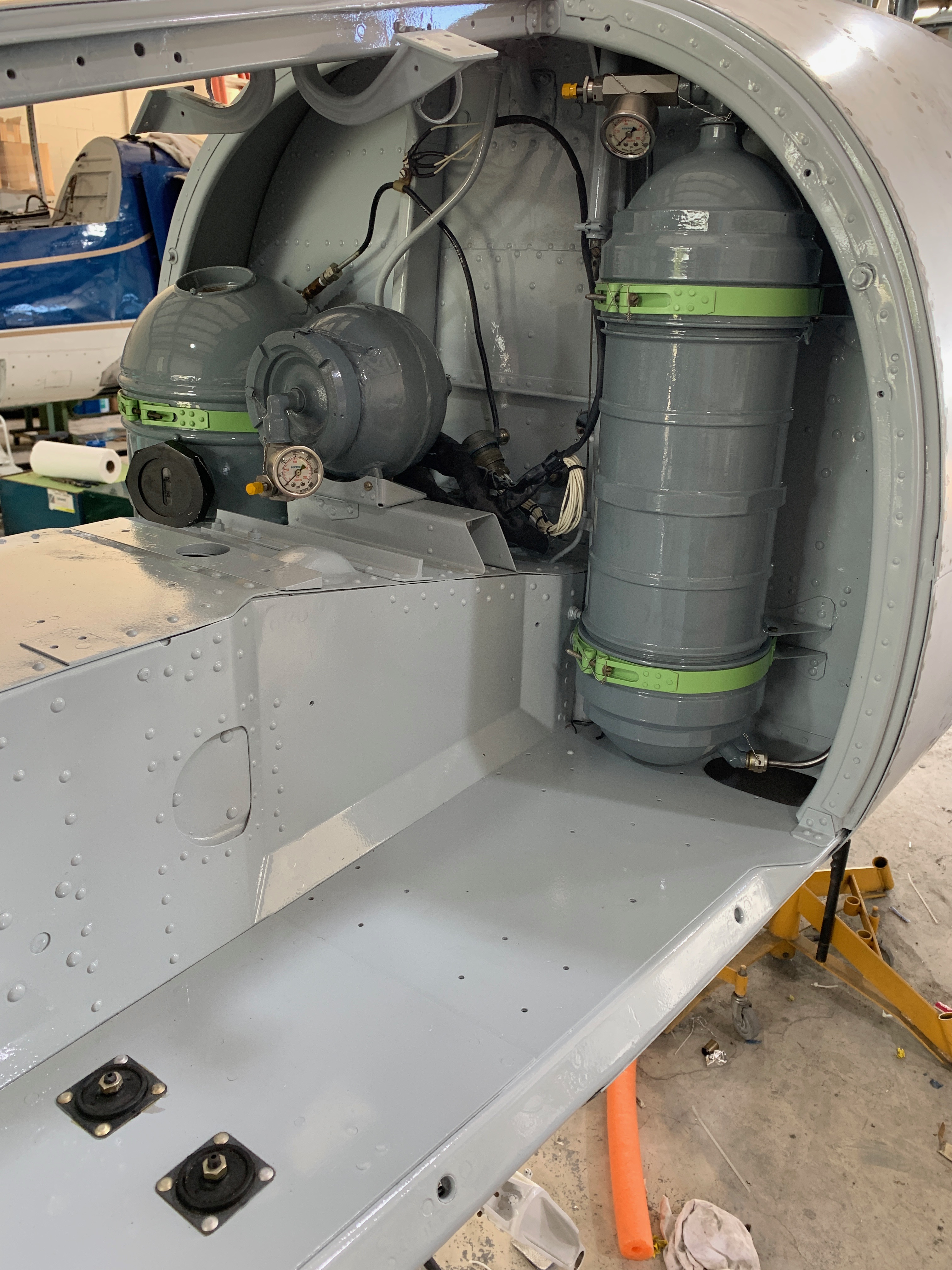 The plane's paint has been stripped and we are now doing all the sheet metal work along with moving the hydraulic reservoirs to the nose to be closer to the improved higher volume electric hydraulic pump pack. Having all elements in the nose bay in place of the old O2 bottles allows easy preflight of hydraulic fluid level and both primary and emergency accumulator charge. All of this and there is still all the room in the nose bay for baggage.