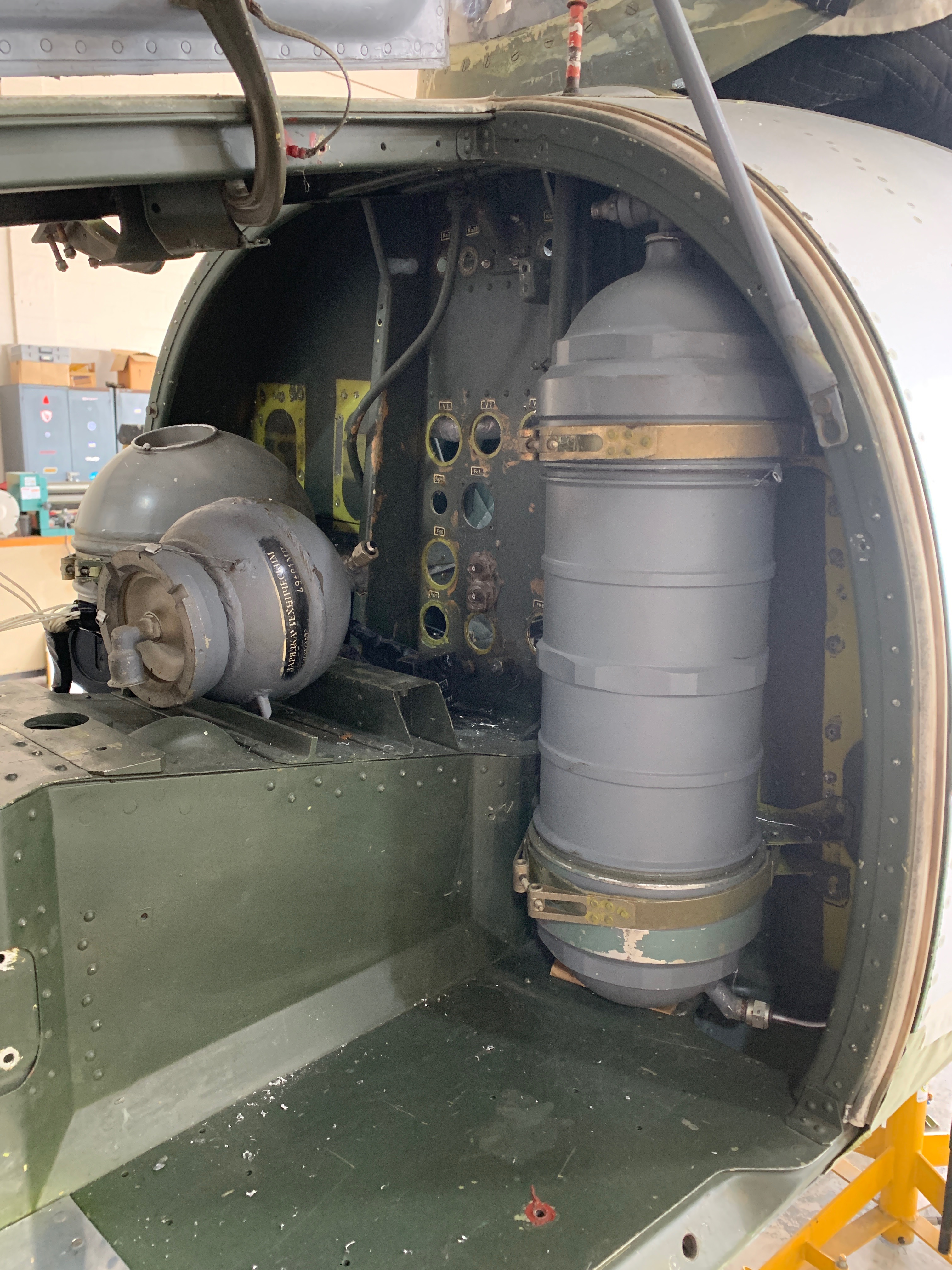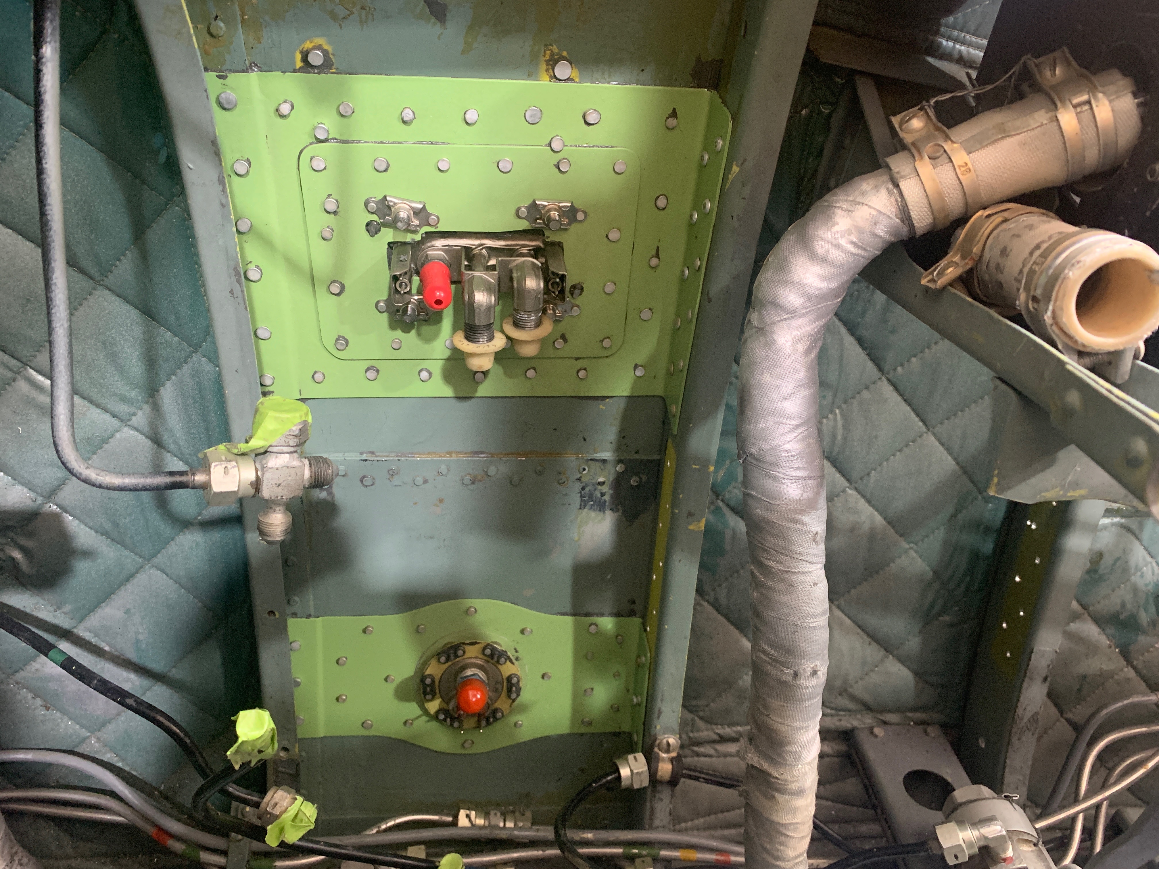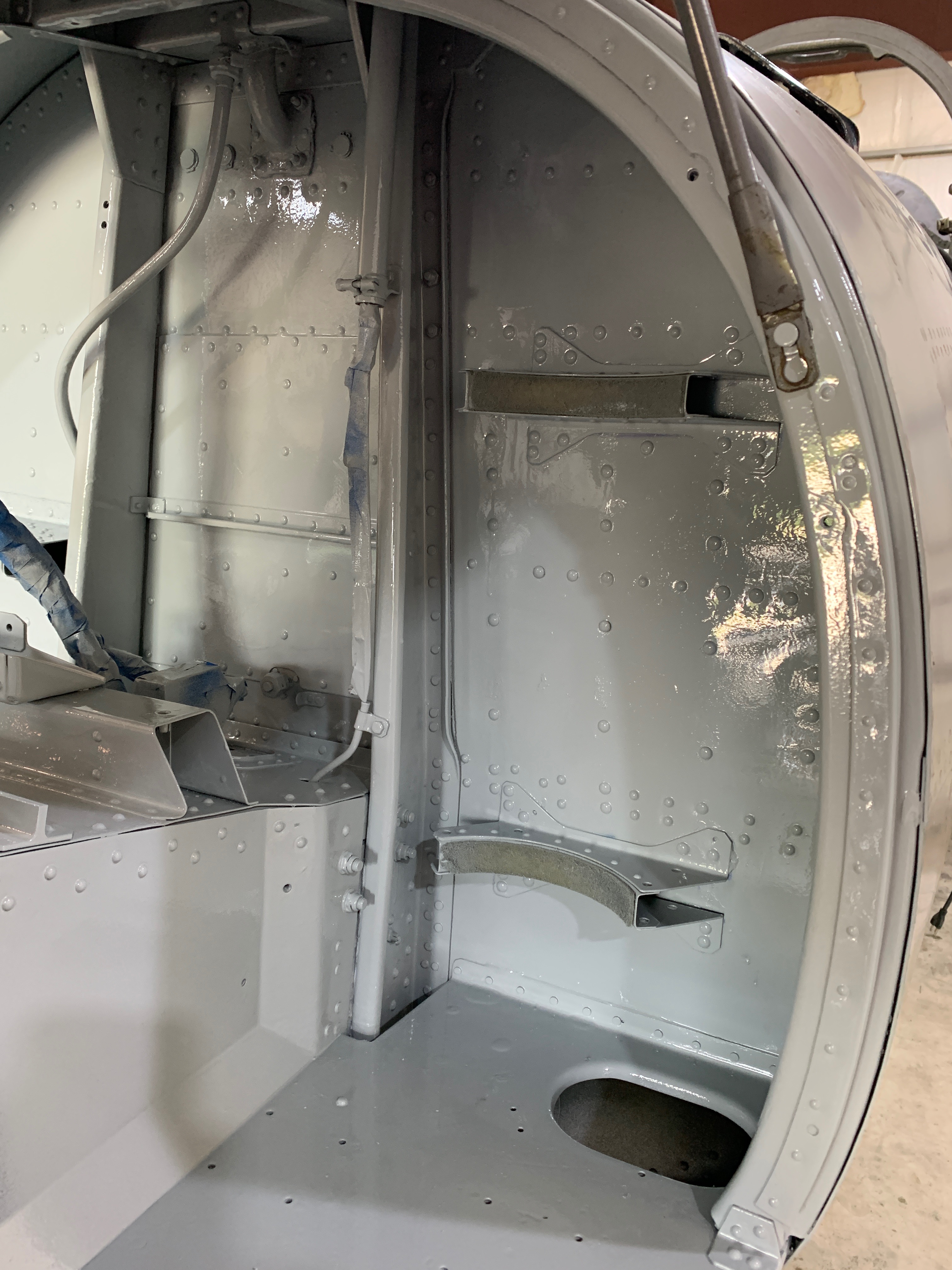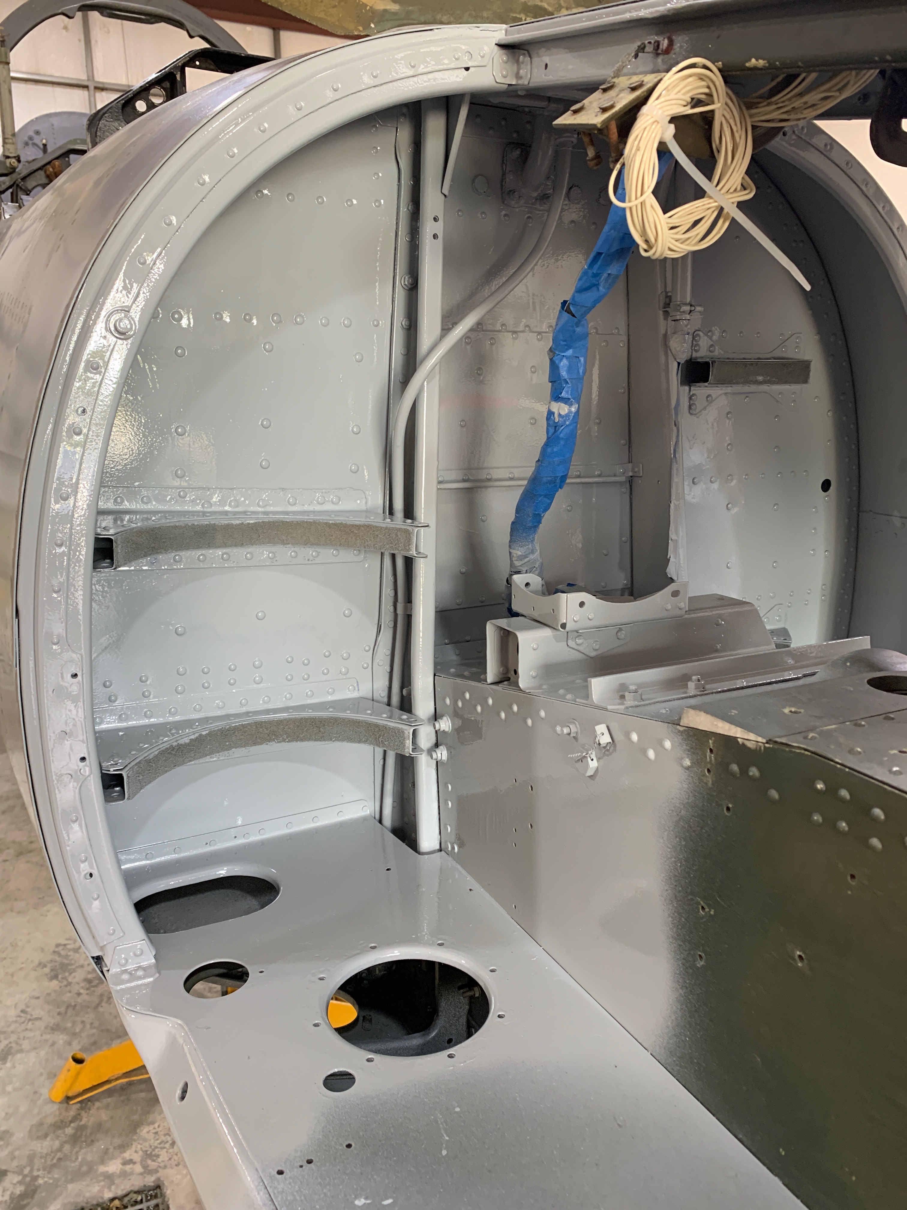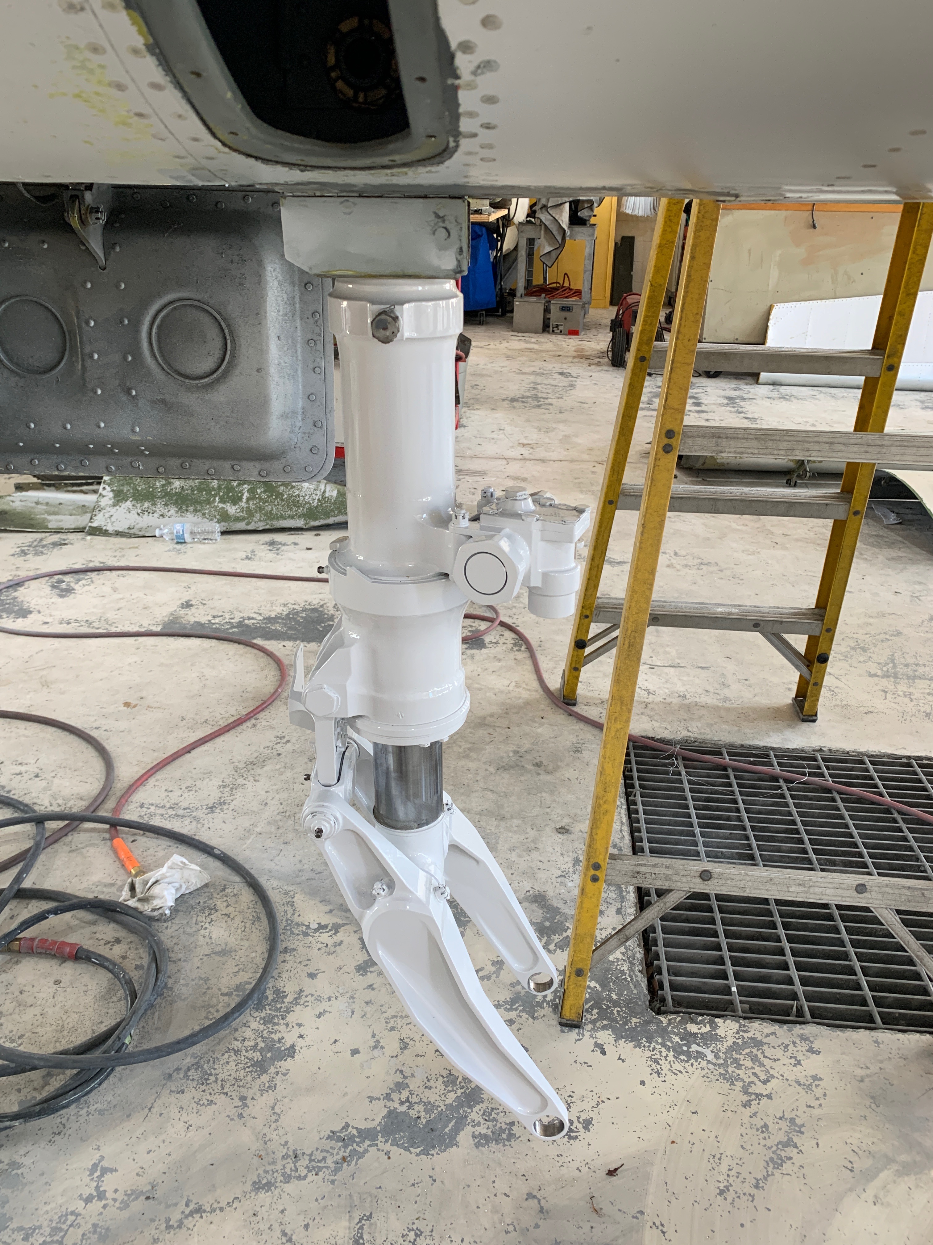 The plane's paint has been stripped and we are now doing all the sheet metal work along with moving the hydraulic reservoirs to the nose to be closer to the improved higher volume electric hydraulic pump pack. Having all elements in the nose bay in place of the old O2 bottles allows easy preflight of hydraulic fluid level and both primary and emergency accumulator charge. All of this and there is still all the room in the nose bay for baggage.