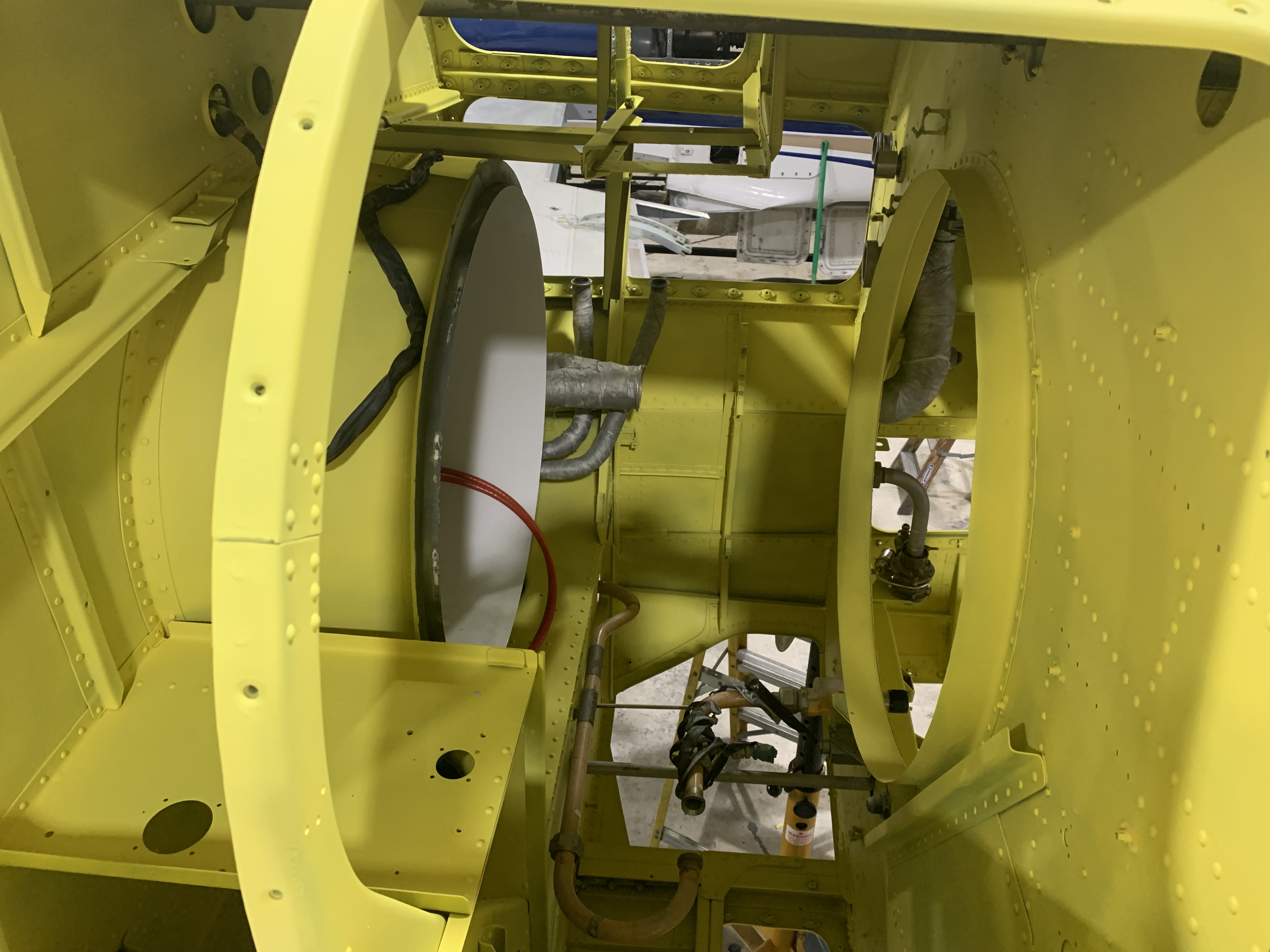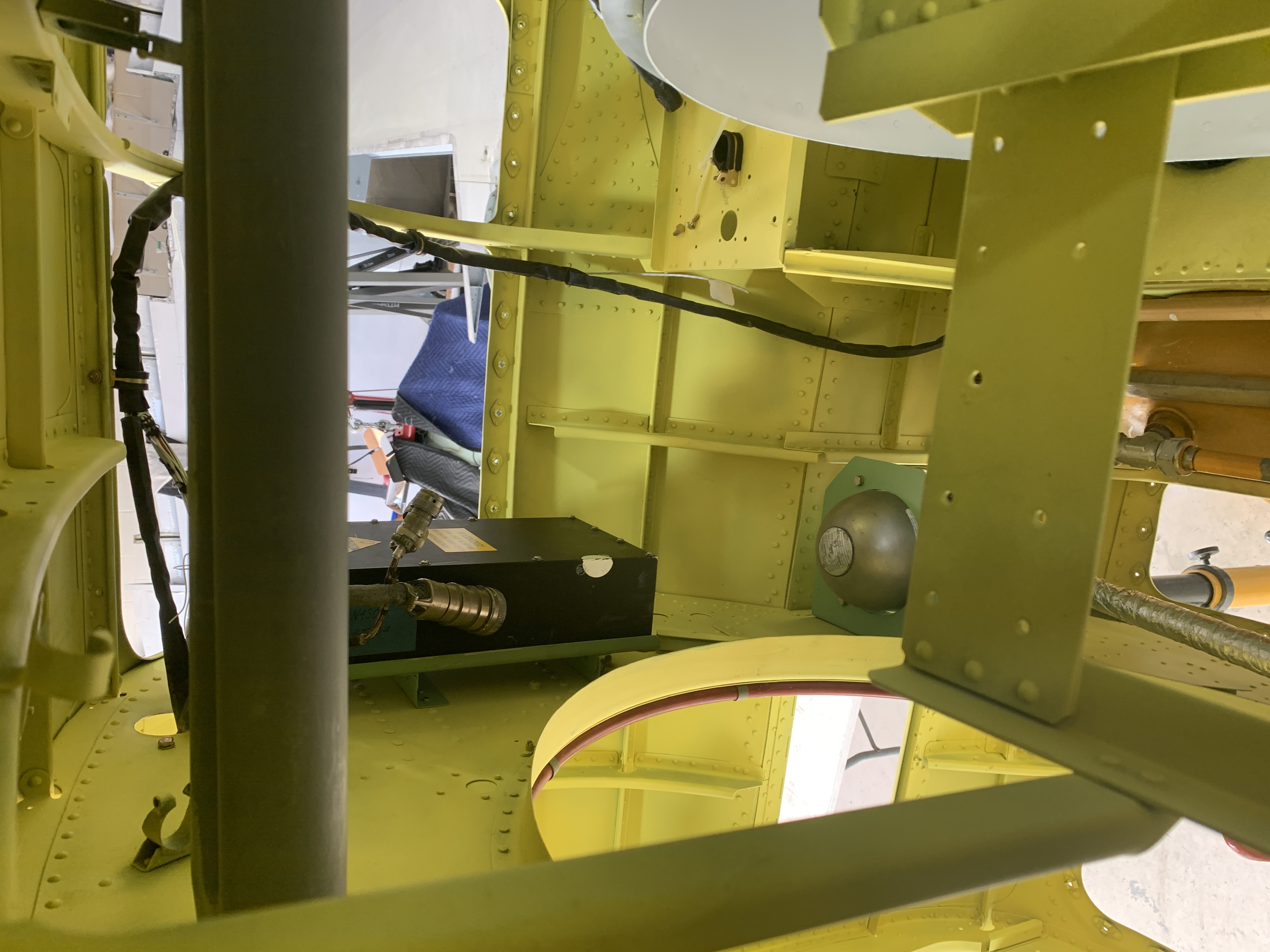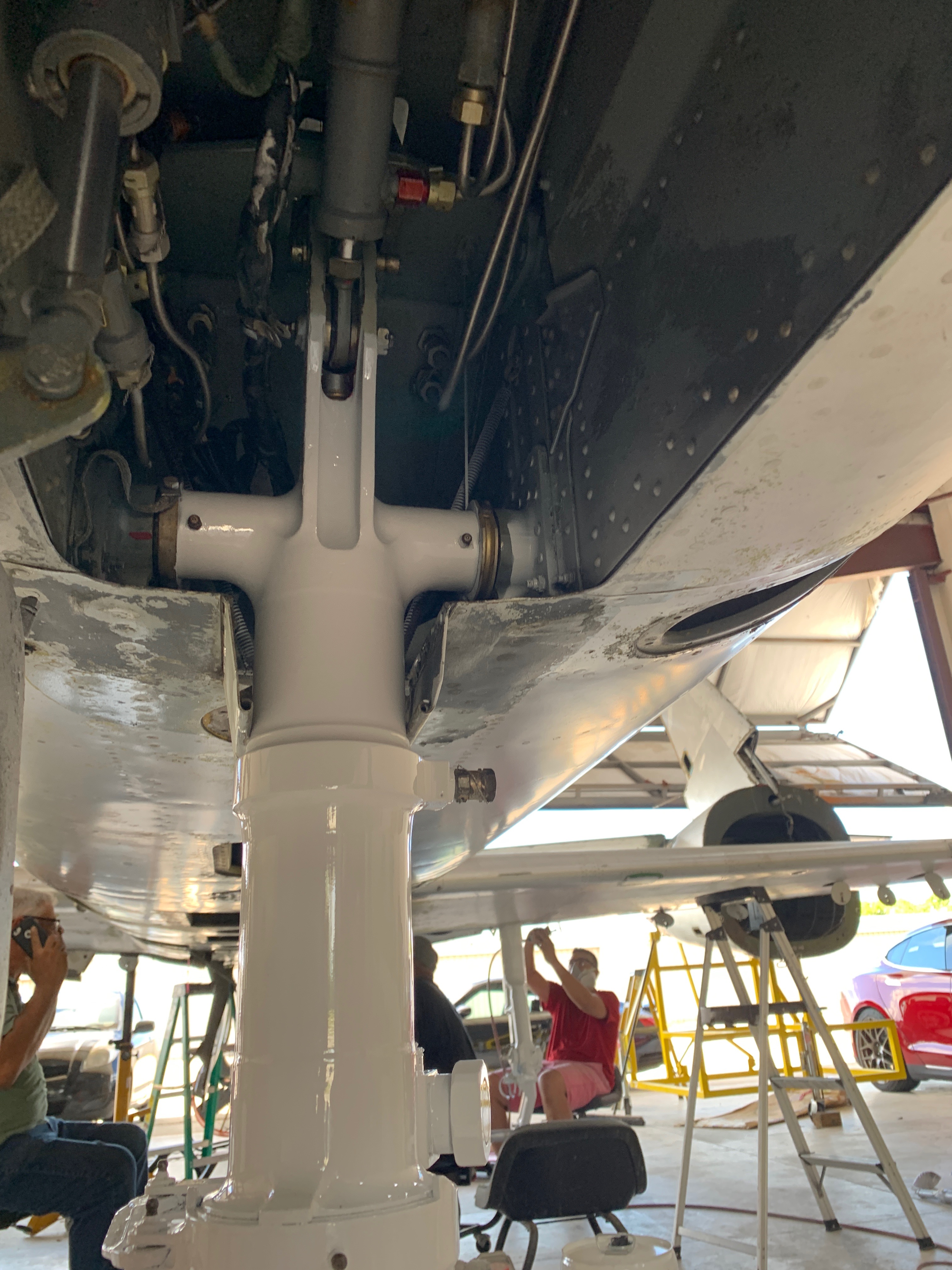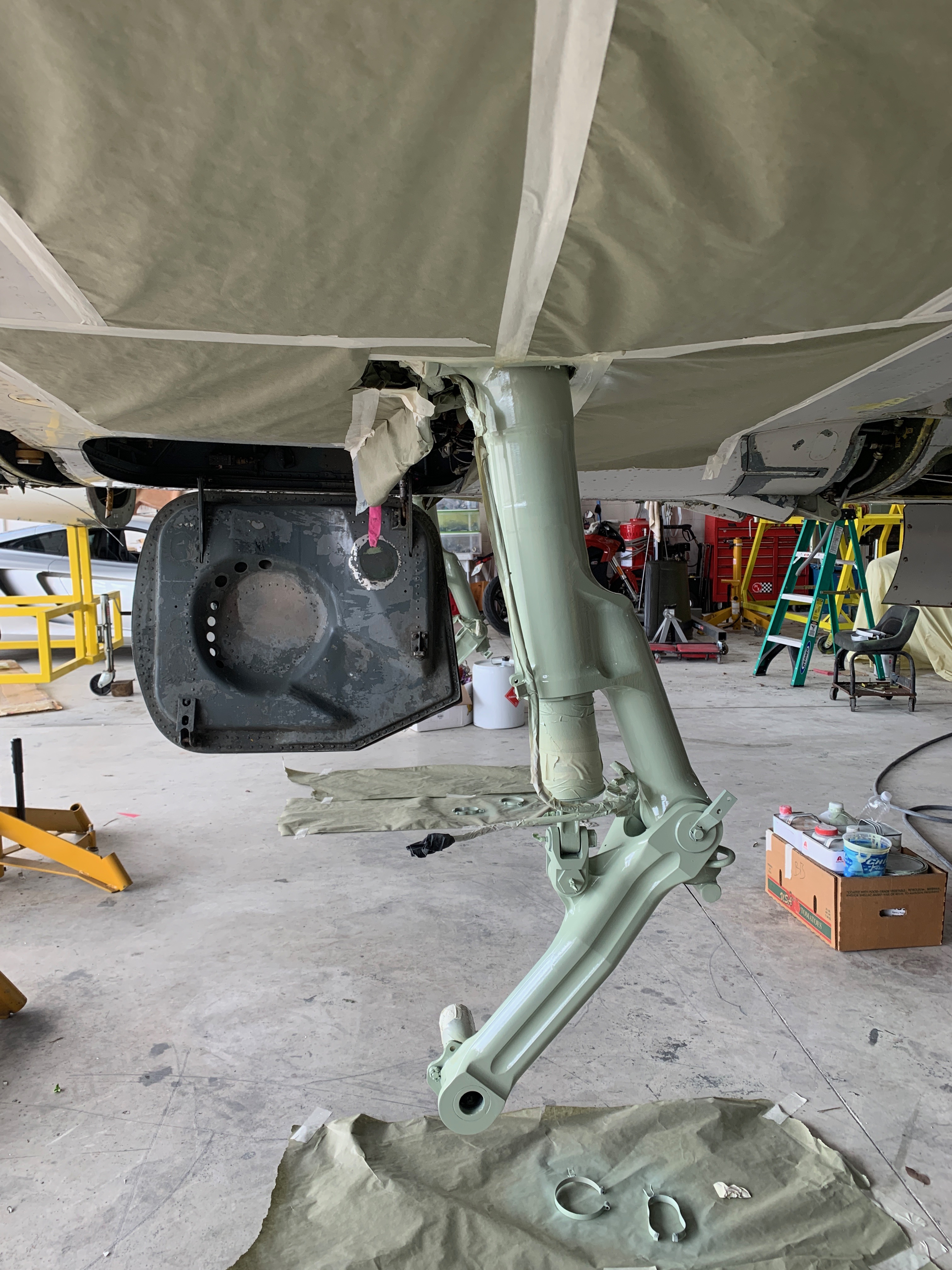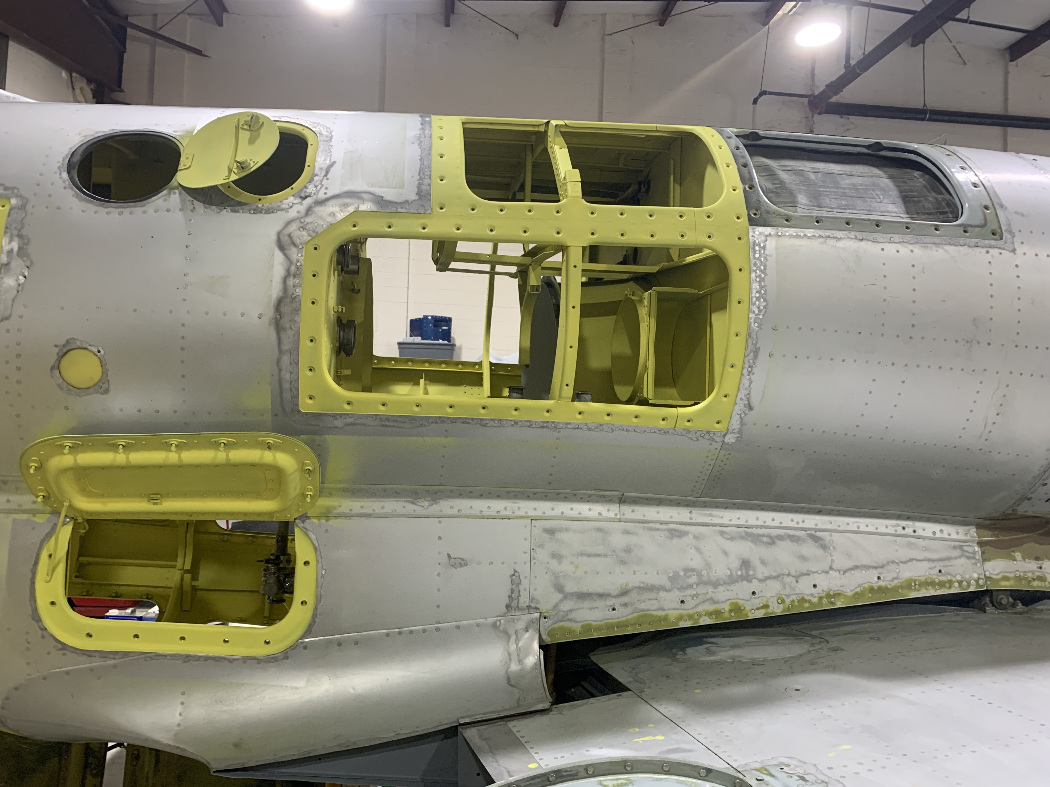 The plane's paint has been stripped and we are now doing all the sheet metal work along with moving the hydraulic reservoirs to the nose to be closer to the improved higher volume electric hydraulic pump pack. Having all elements in the nose bay in place of the old O2 bottles allows easy preflight of hydraulic fluid level and both primary and emergency accumulator charge. All of this and there is still all the room in the nose bay for baggage.