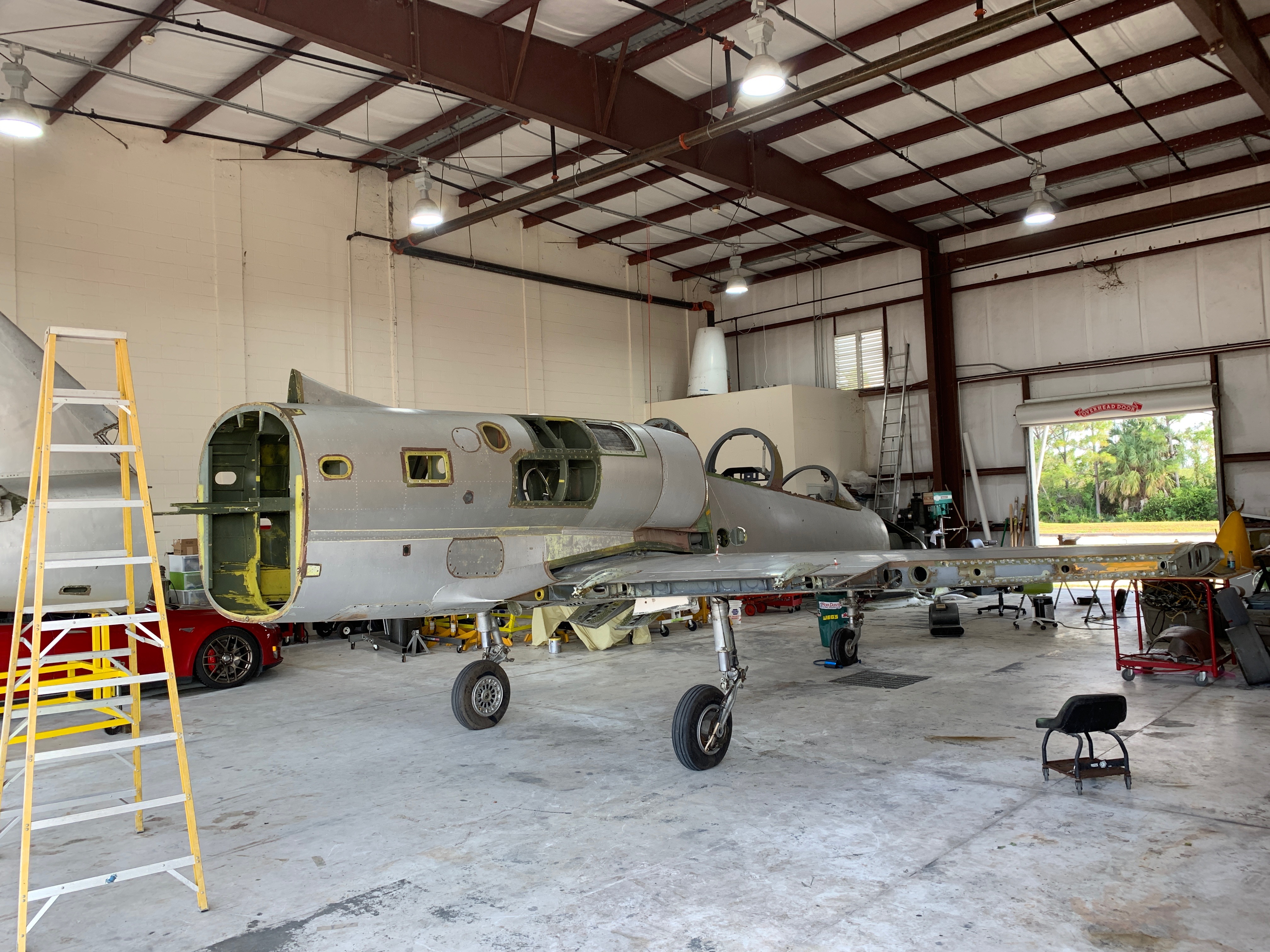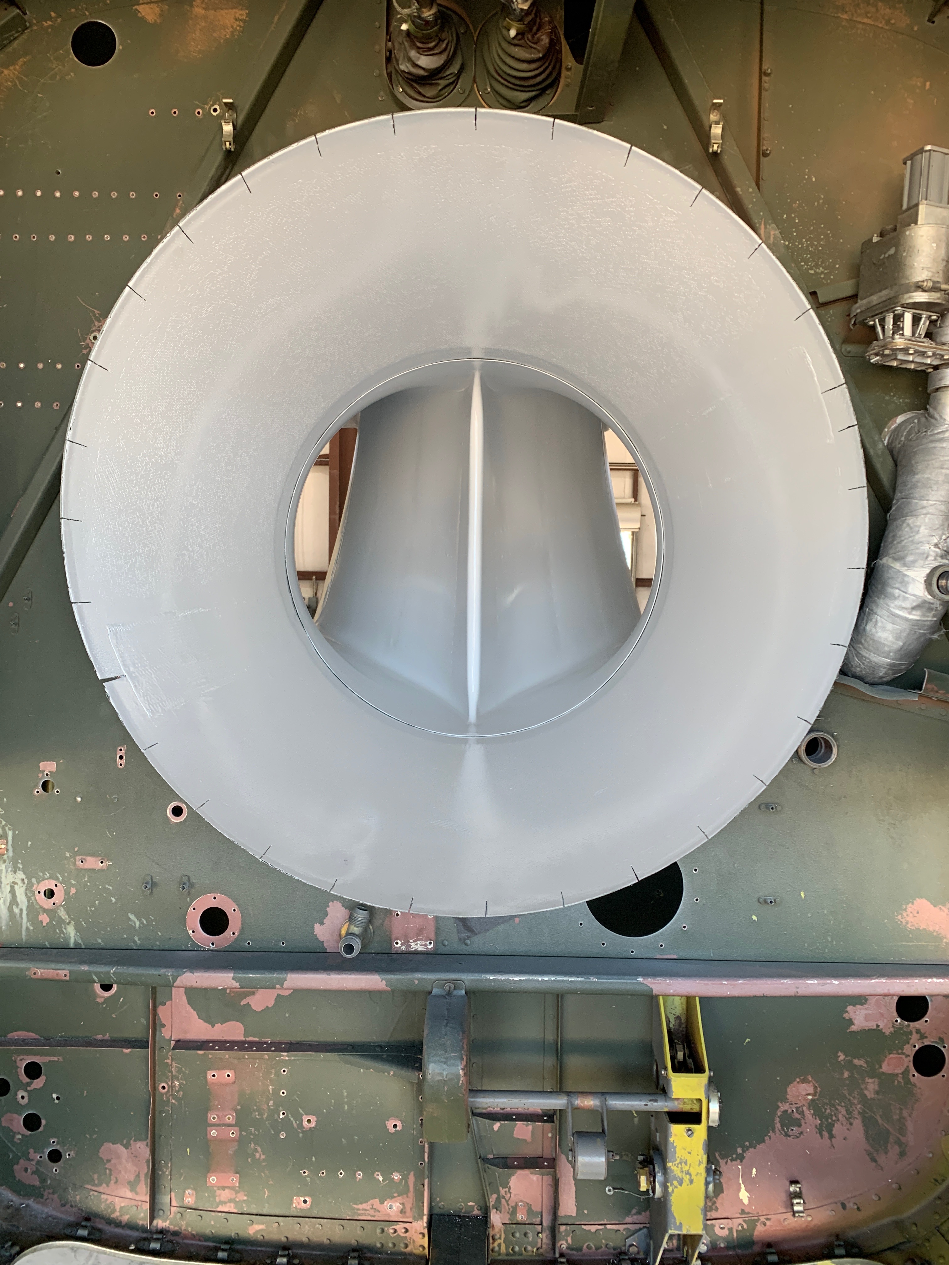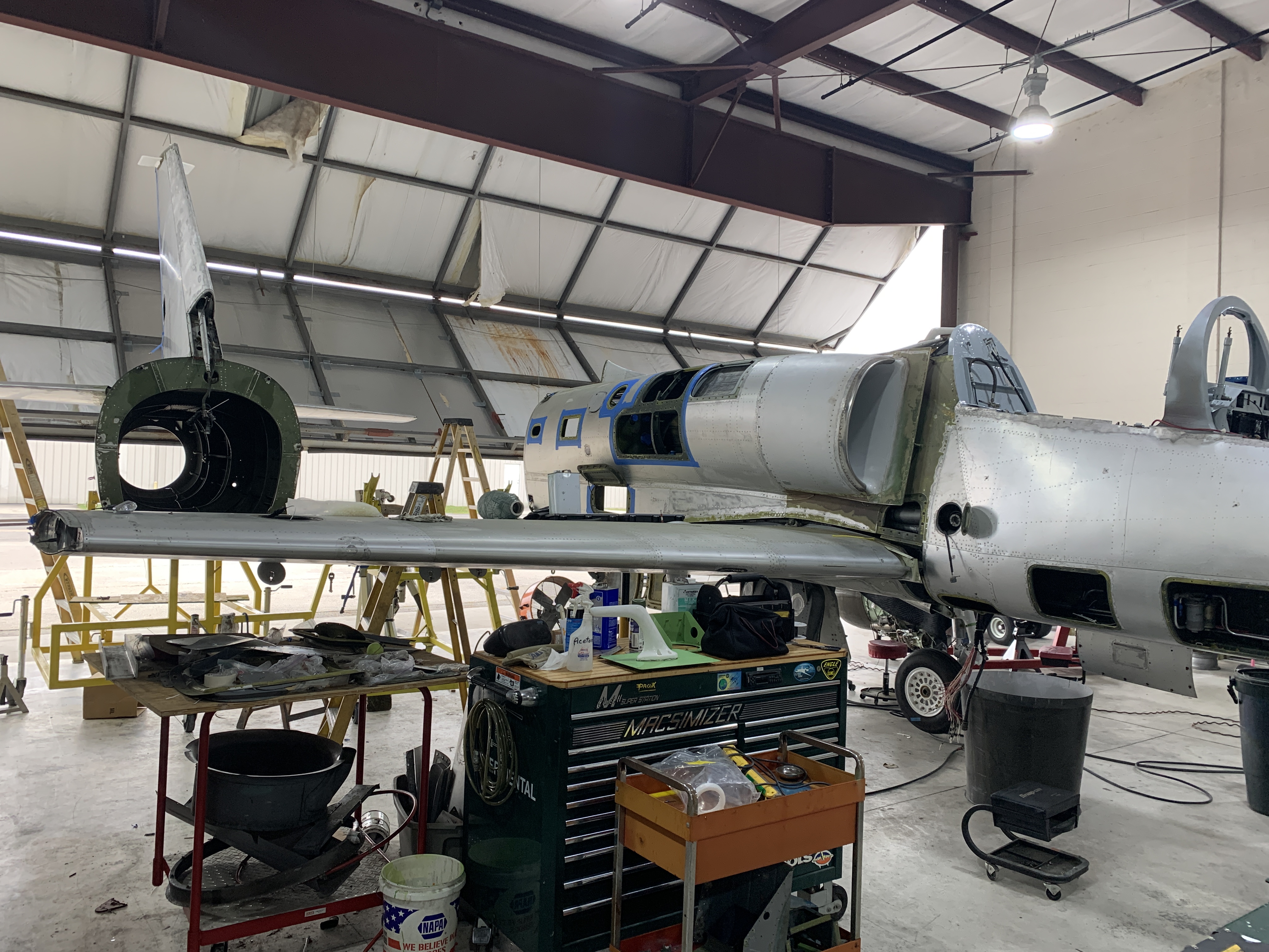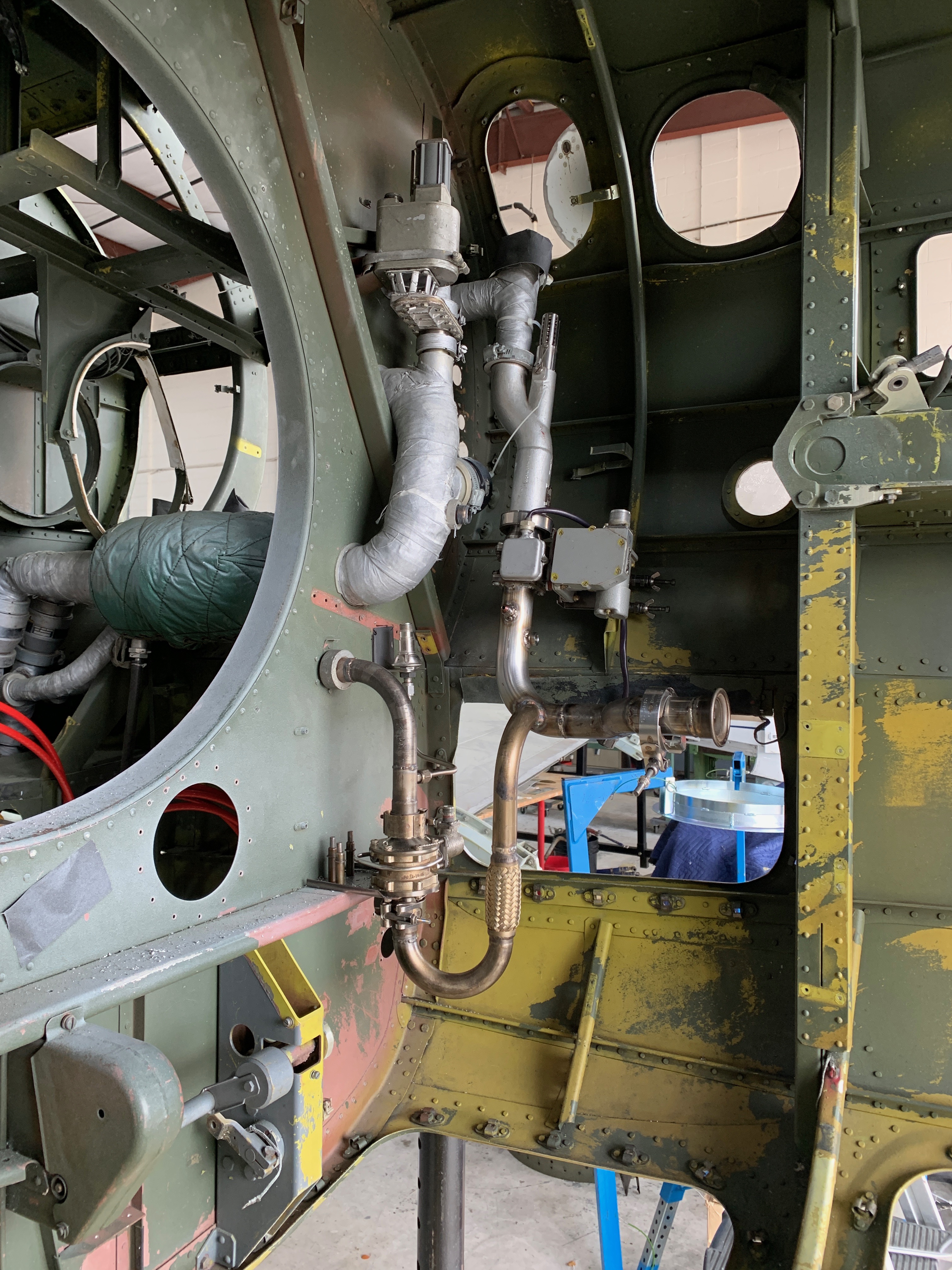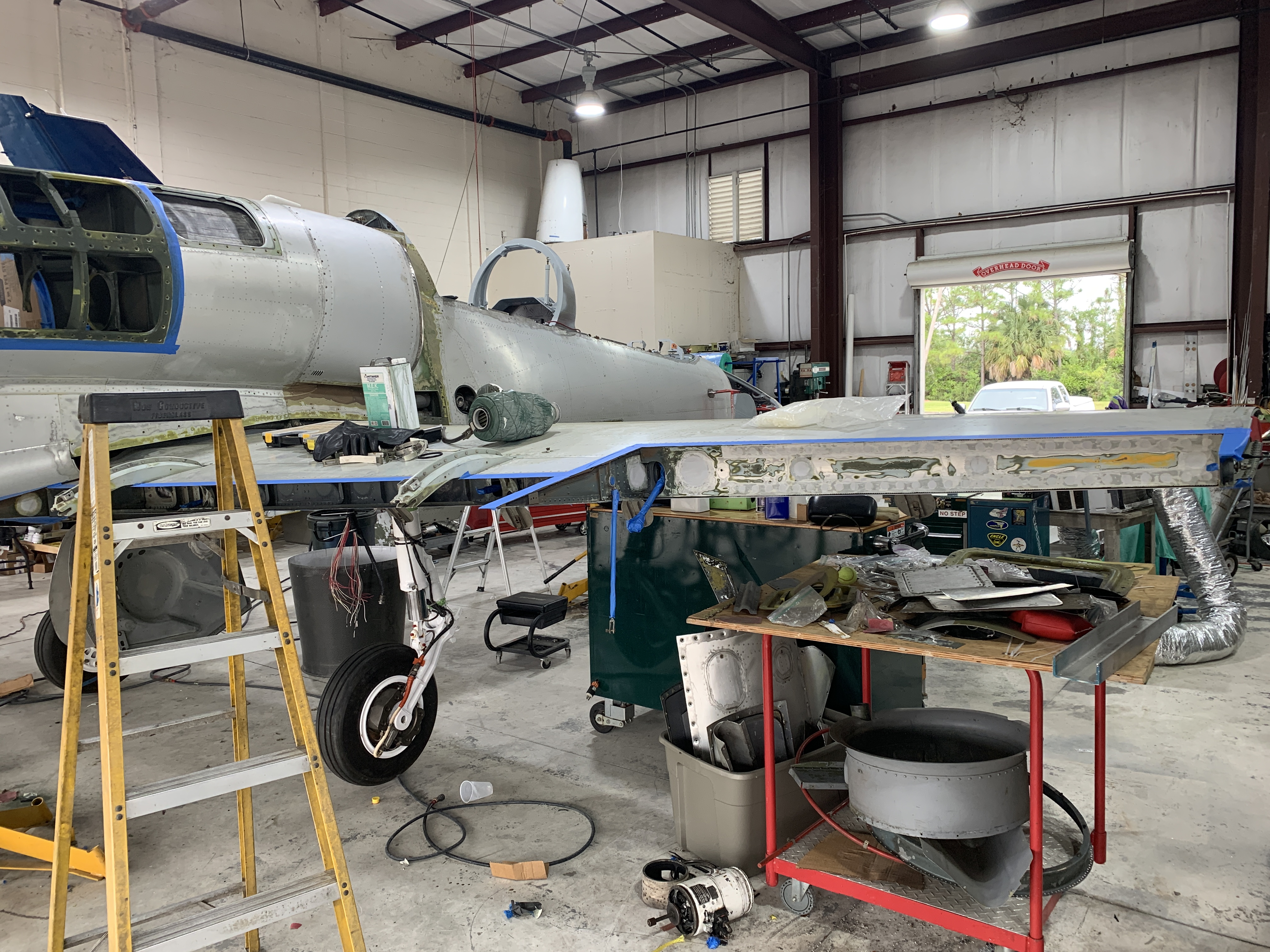 The plane's paint has been stripped and we are now doing all the sheet metal work along with moving the hydraulic reservoirs to the nose to be closer to the improved higher volume electric hydraulic pump pack. Having all elements in the nose bay in place of the old O2 bottles allows easy preflight of hydraulic fluid level and both primary and emergency accumulator charge. All of this and there is still all the room in the nose bay for baggage.