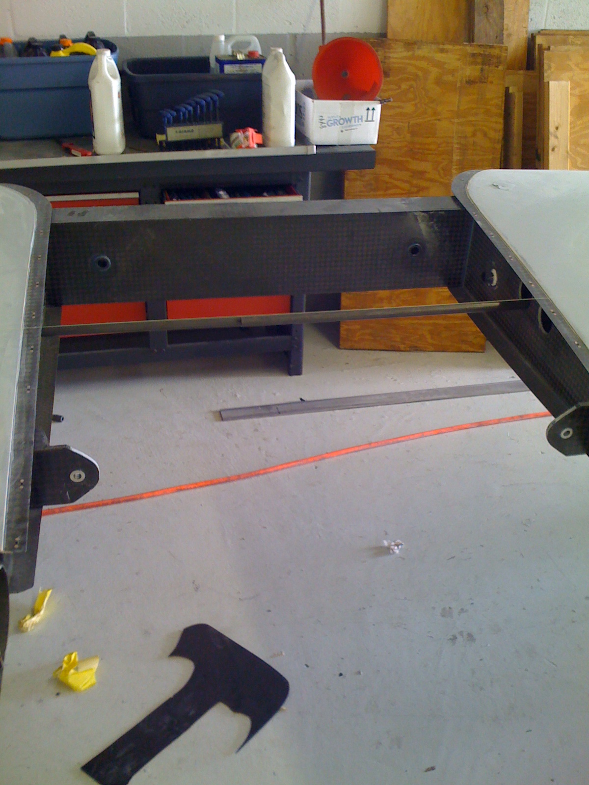 The long aileron Push-Pull rods are awaiting the return of the fuselage so the torque tube can be bonded in and then PP rod the lengths can be set. The rigging pins were set with string.