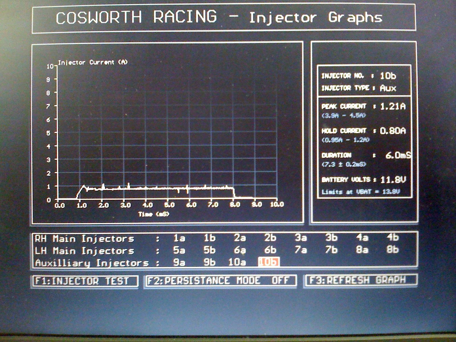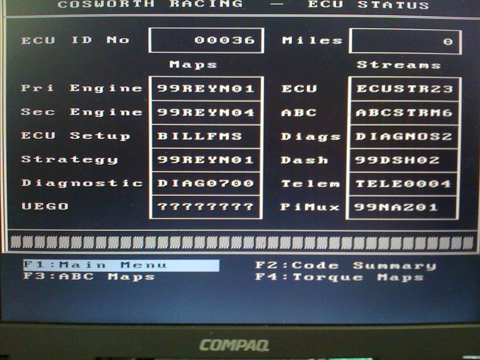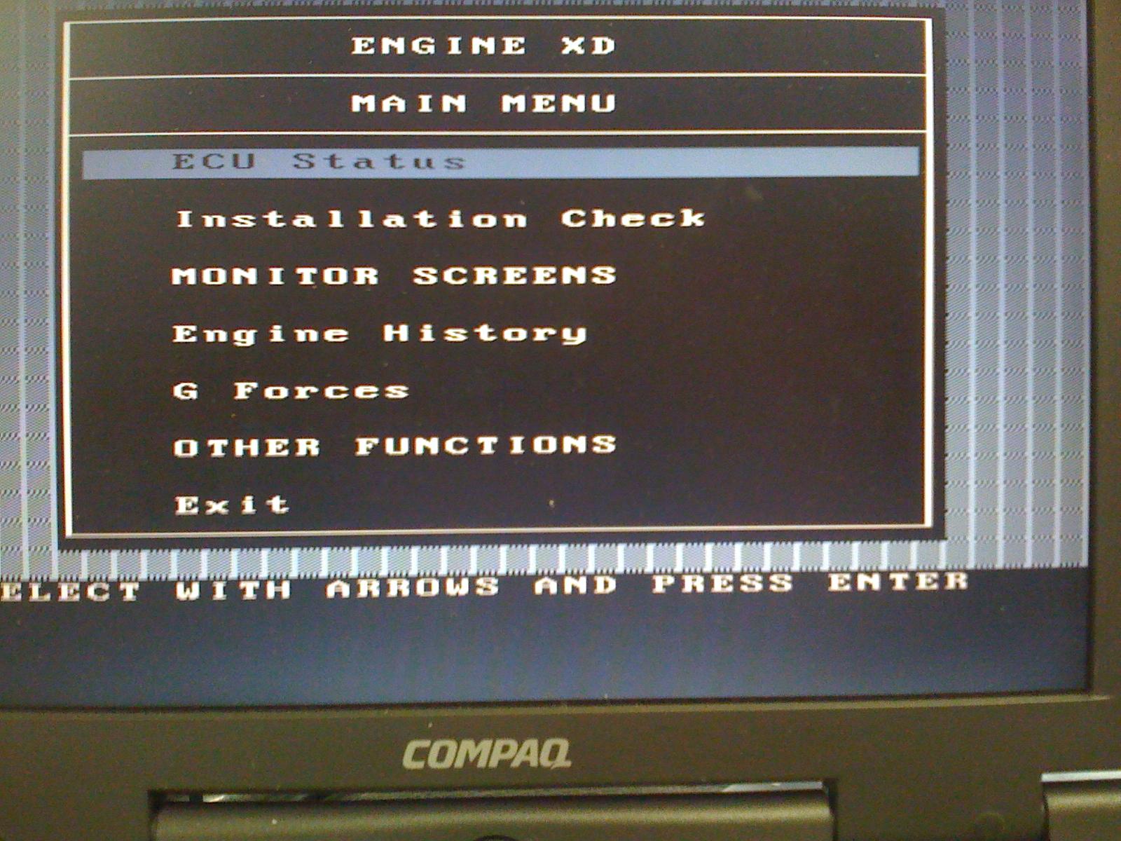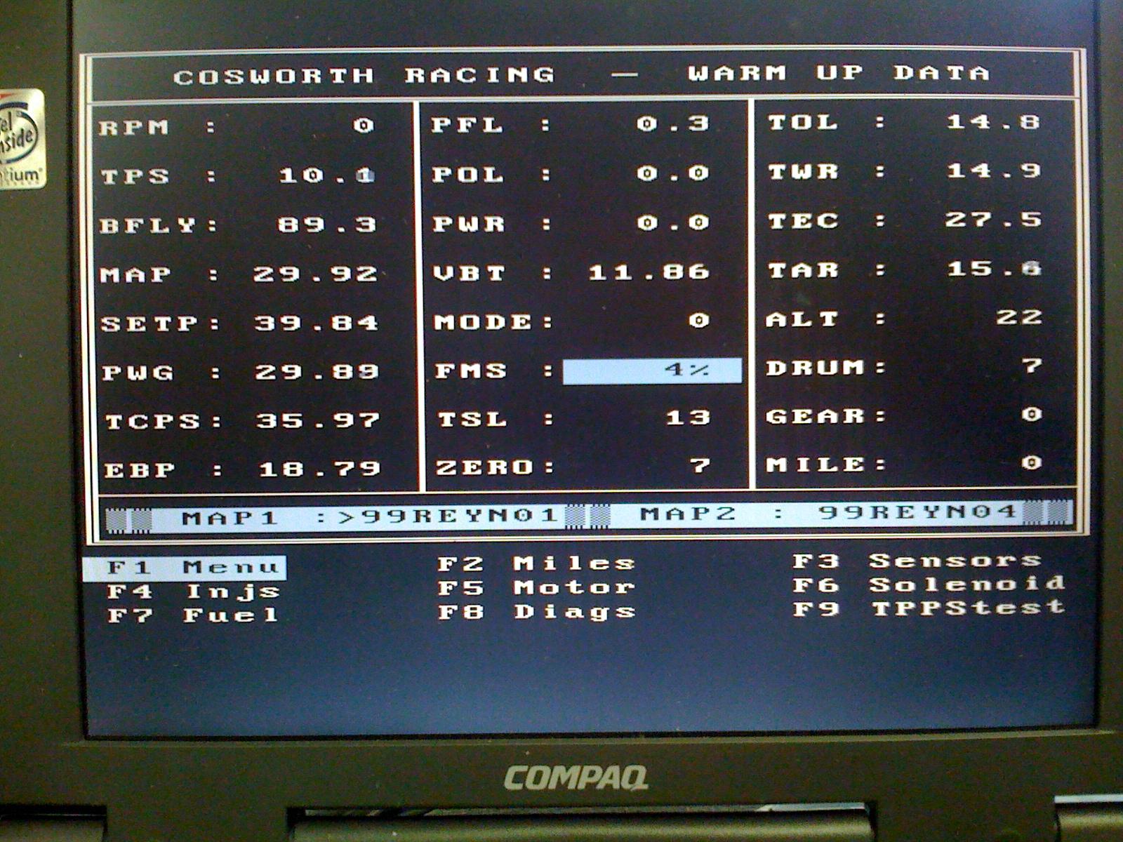 If the car will not start, the first thing you need to do is plug in a laptop, run the XD Monitor software and check that TPS responds when you move the throttle. The XD Monitor software is DOS based stuff so you will need a Windows 95 or 98 laptop (or just plain DOS) to run it. The CAN interface data cable is proprietary (one for the 99 Lola pictured below) and works only with a real legacy 25 pin parallel port on a laptop. The cable is powered by the car so the start up sequence goes like this. Start up the laptop and run the XD Monitor software. A start up screen will appear. Do not choose anything yet. Plug the cable into the car and the laptop with ECU power at the car off. Turn on ECU power on the car (ignition is not required so leave that switch off) then continue on with the XD monitor software. There are screen shots of the main menue, ECU Status, Warm Up Data and Injector Test screens to give you some examples. Most of the time you will be in the Warm Up Data screen as you can use this menue to test the 9th butterfly (F5 Motor), injectors (F4) and so on. The sequence is Main Menu to Monitor Screens to Warm Up Data.
