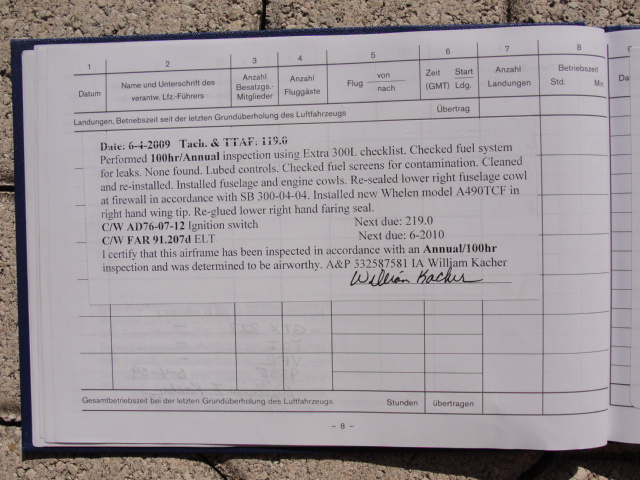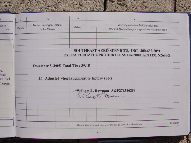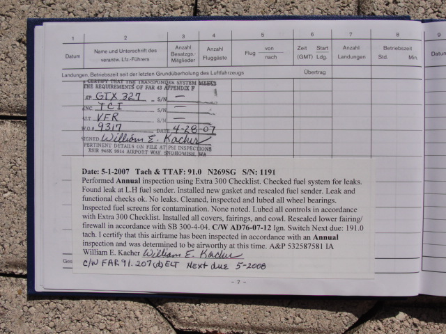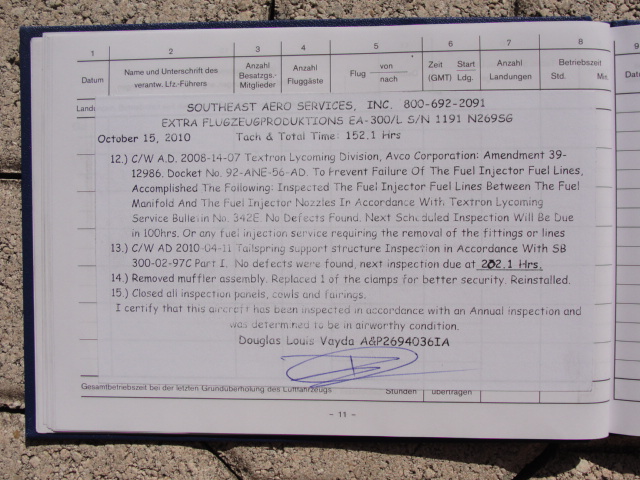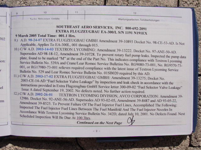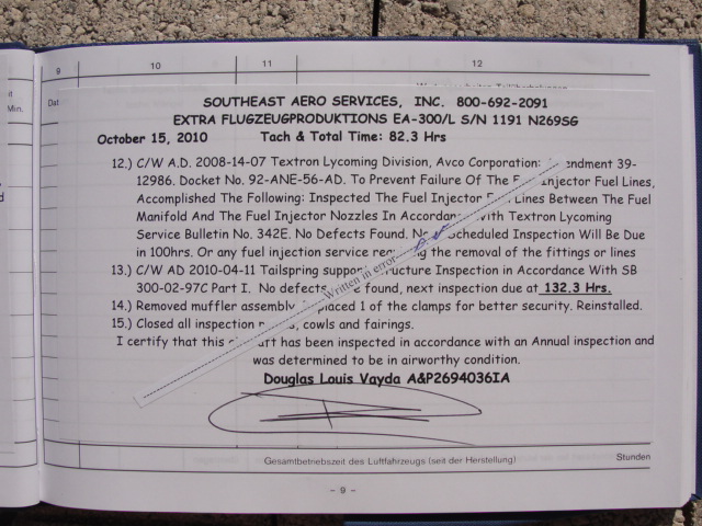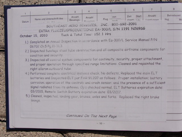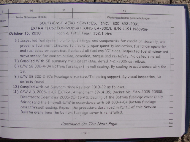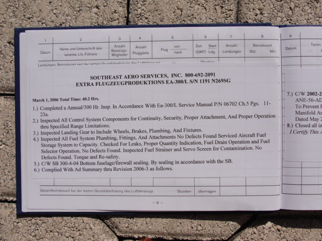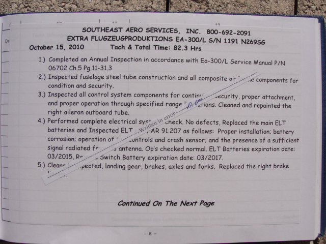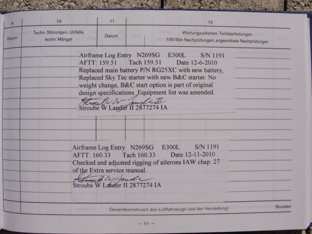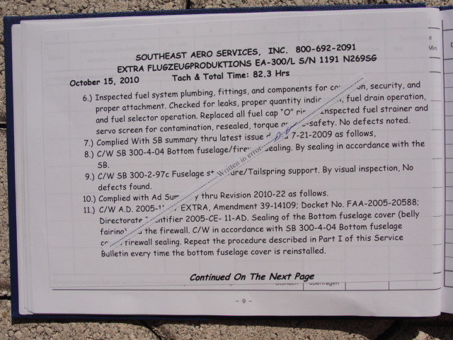 These are photos of the N269SG's airframe log book as of January 3, 2011. Note that there is a left and right page for each page number. For example, you will see two photos below, each having an "8" at the bottom. This would be a photo of the left and ride side of "page 8".