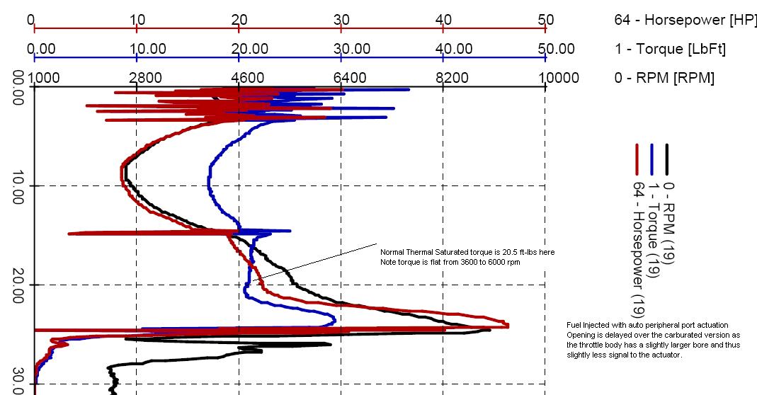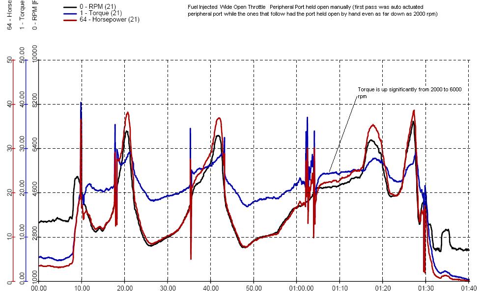Here you can graphically compare an auto actuation of the peripheral port with a manual actuation. The auto actuation is a best case scenario with elevated torque values as the rotor has yet to thermo saturate. This graph is elevated by one to two ft-lbs in the 3500 to 6000 rpm range. This thermo saturation phenomenon points out the need for a thermal barrier on the rotor face to prevent inlet charge heating. Slowing thermal transfer from the combustion chamber to the incoming charge will improve torque by elevating charge density and keeping the heat in the combustion chamber where it can do more work. This should also improve bearing life.