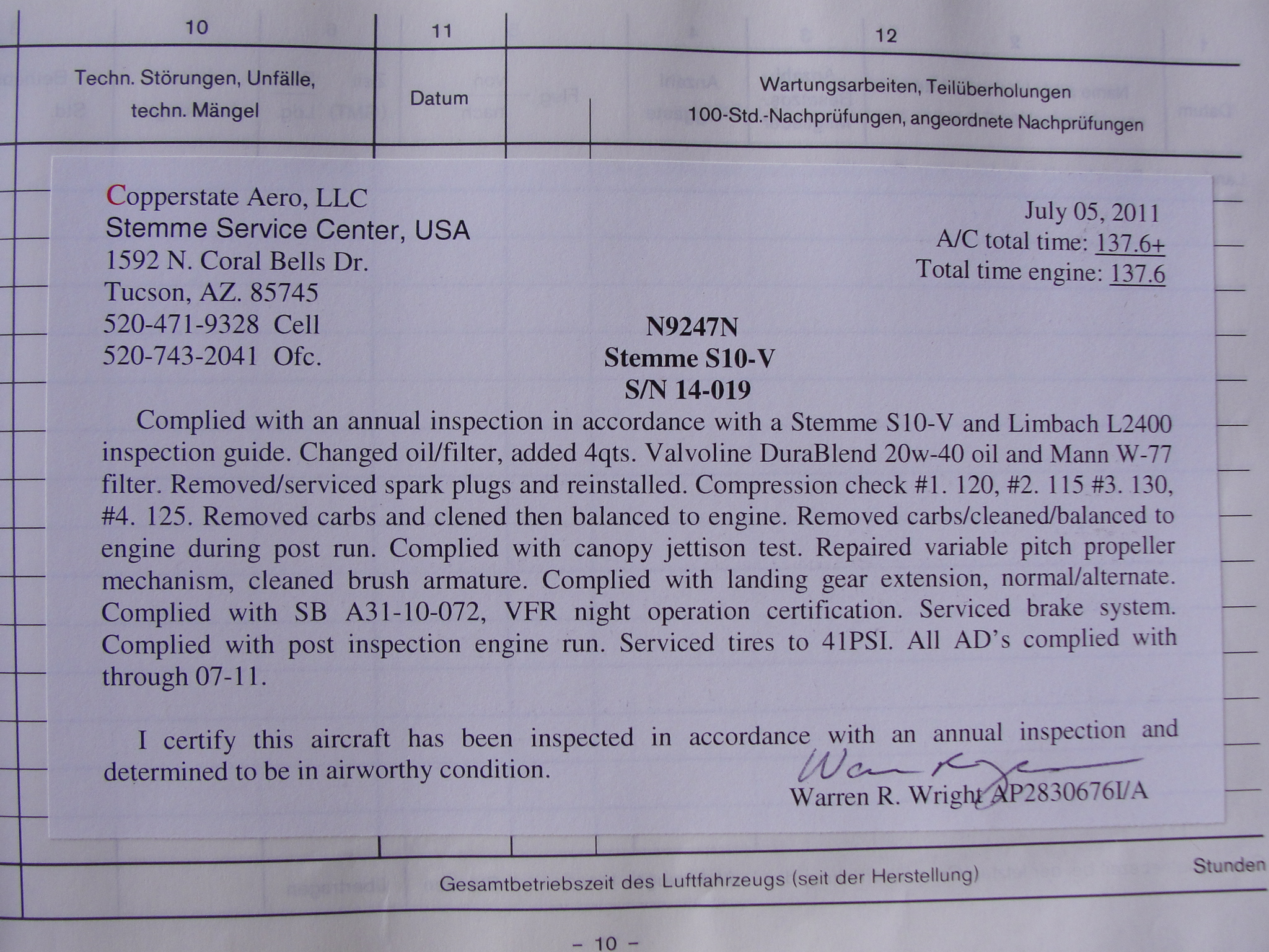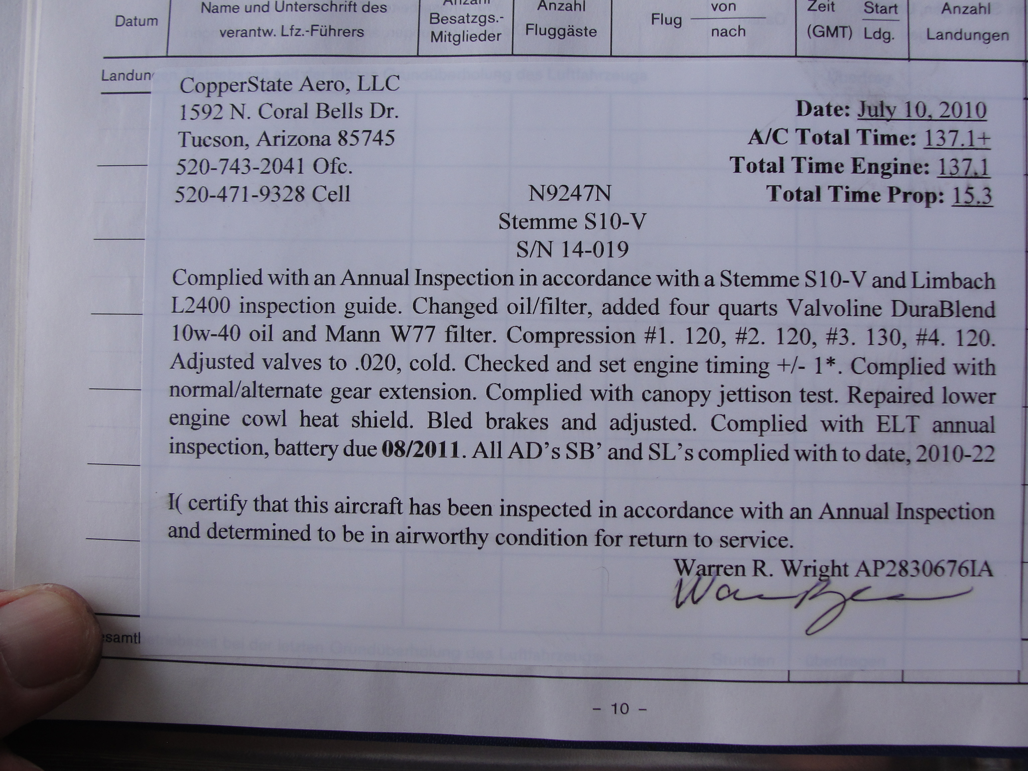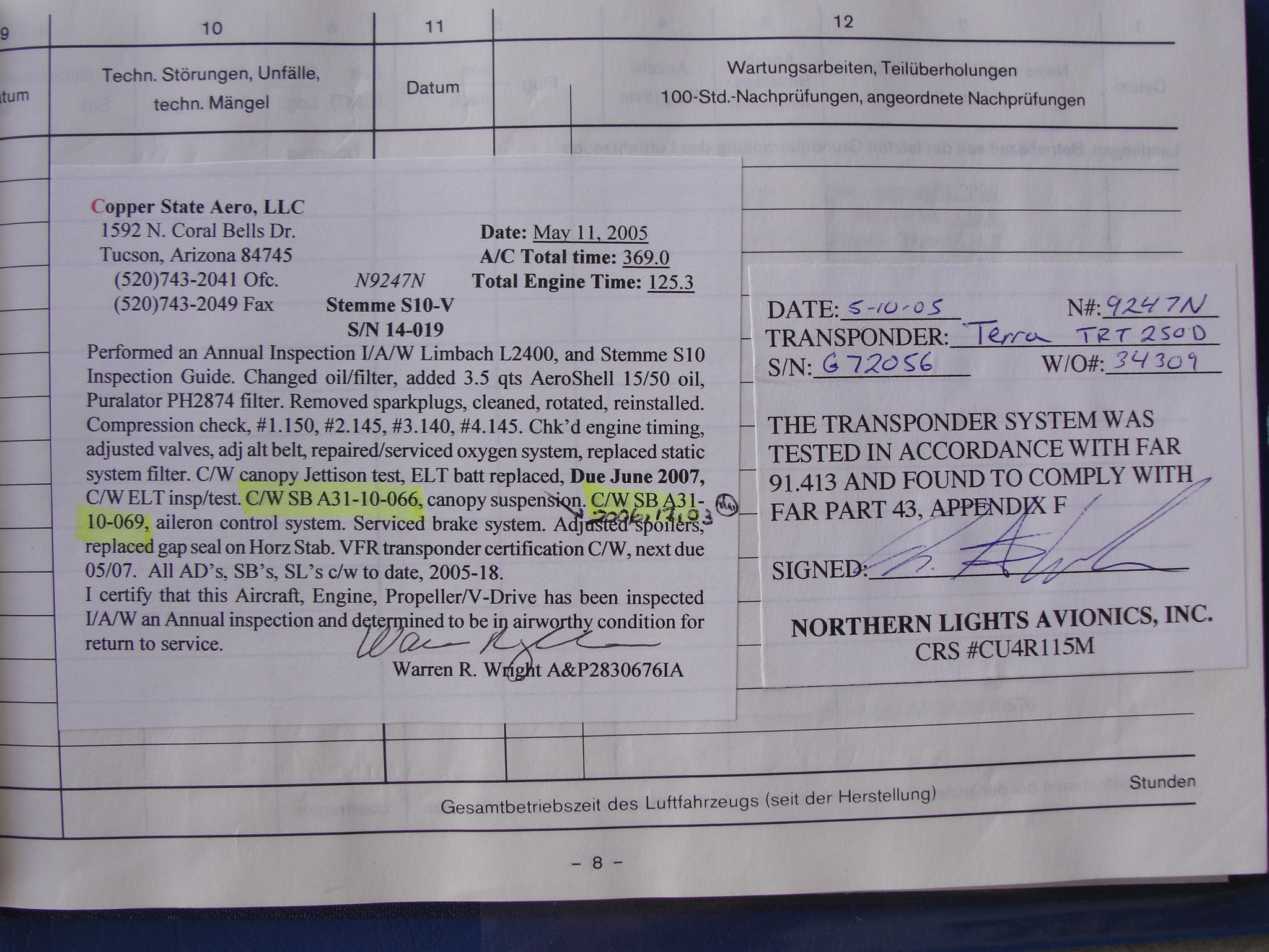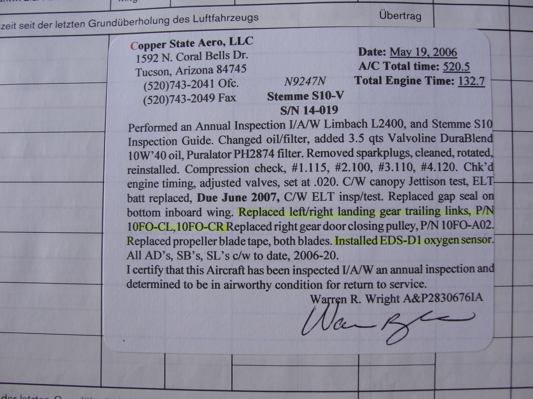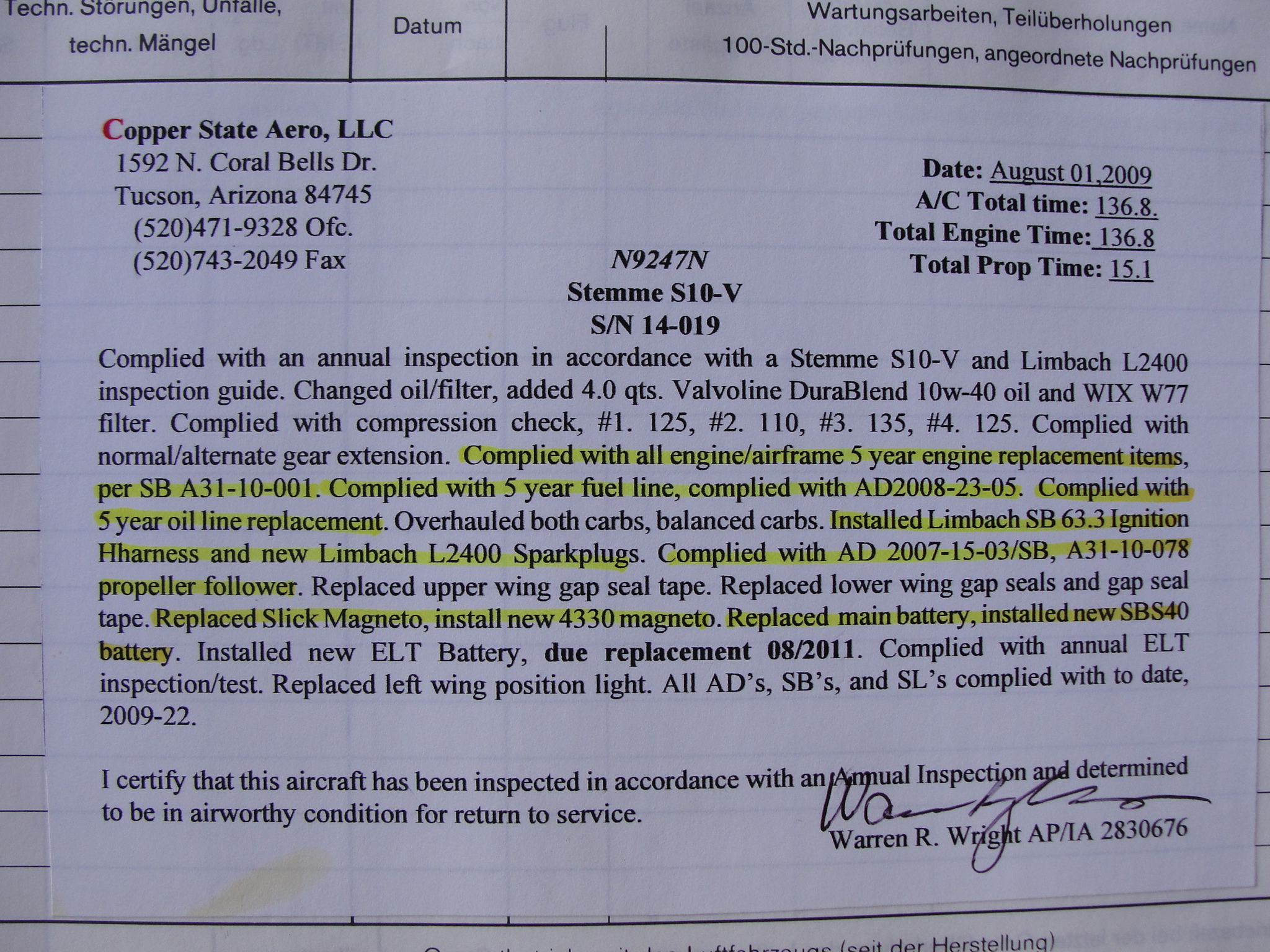 .....currently coming out of annual including propeller overhaul, all drive line rubber parts, propeller mounts, fuel lines, gear overhaul, brake lines (and master/slaves rebuild), AeroLeds, Butterfly Vario, Trigg Mode S, paint,,